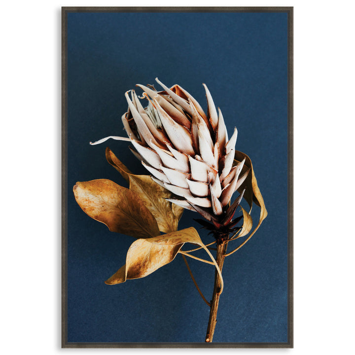 Framed Canvas: Luxe Floral I is a contemporary floral design of a dried protea on a dark blue background. The blush and golden hues will compliment other natural timber elements in your decor. Luxe Floral is printed on high quality glossy poly-cotton canvas featuring high whiteness and superior colour brilliance and image definition with UV stabilised solvent ink. The canvas is stretched over a sturdy pine support frame and is assembled with a high quality open grain stained timber floating moulding, with a shadow line, D-Rings and strung ready to hang. Australian made under an Australian Made Campaign Ltd licence.