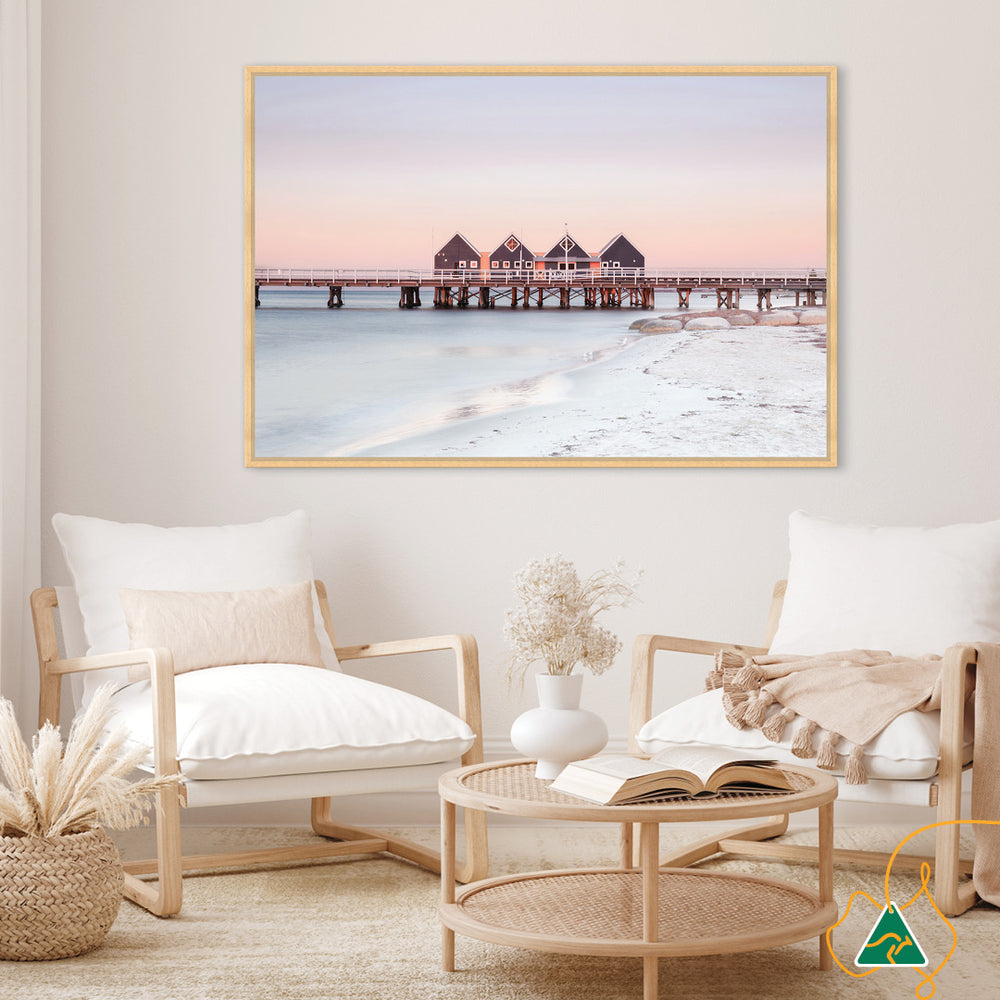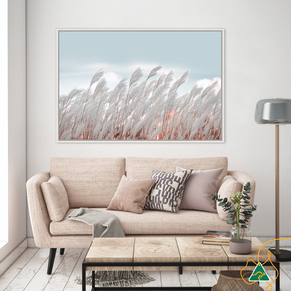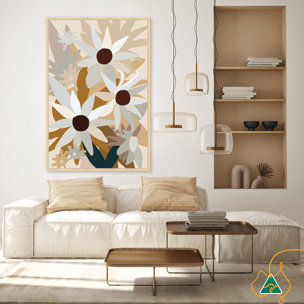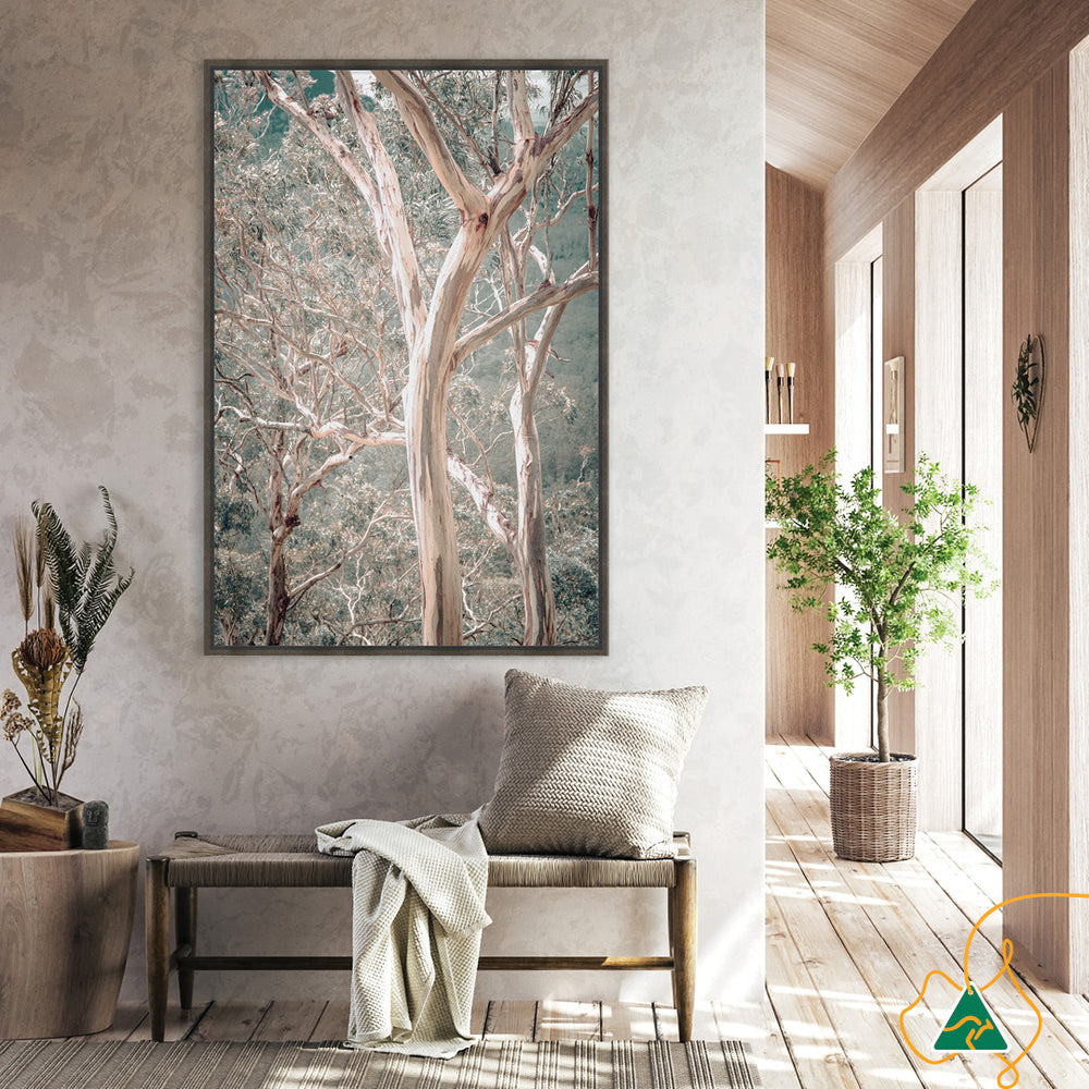 Framed Canvas is stunning photographic, gorgeous graphic and beautiful painted imagery printed on high quality glossy poly-cotton canvas featuring high whiteness and superior colour brilliance and image definition with UV stabilised solvent ink. The canvas is stretched over a sturdy pine support frame and is assembled with a high quality open grain stained timber floating moulding, with a shadow line, D-Rings and strung ready to hang. Australian made under an Australian Made Campaign Ltd licence.