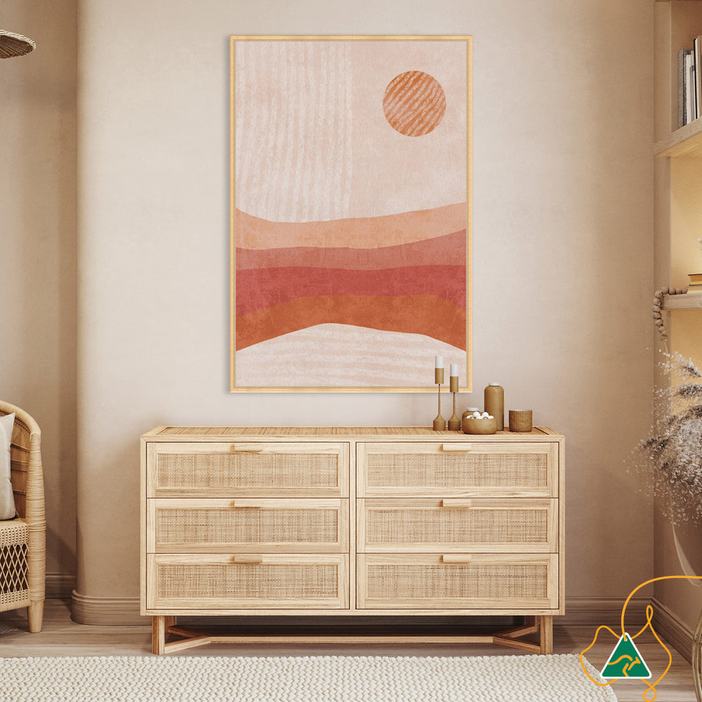 Framed Canvas is stunning photographic, gorgeous graphic and beautiful painted imagery printed on high quality glossy poly-cotton canvas featuring high whiteness and superior colour brilliance and image definition with UV stabilised solvent ink. The canvas is stretched over a sturdy pine support frame and is assembled with a high quality open grain stained timber floating moulding, with a shadow line, D-Rings and strung ready to hang. Australian made under an Australian Made Campaign Ltd licence.