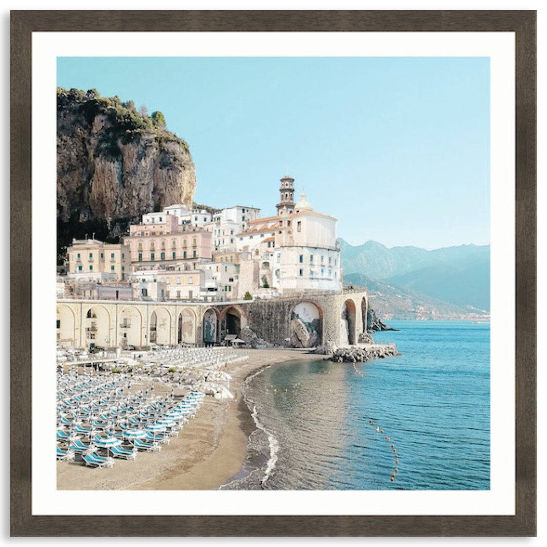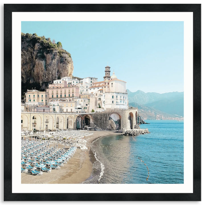 Framed Print: Amalfi Beach II is a contemporary coastal landscape of the Italian township of Atrani. Be inspired by the vacation vibe of the Mediterranean with rows of beach umbrellas and crystal waters. Amalfi Beach II creates a calm, relaxed atmosphere with amazing azure hues, brilliant whites and sunset colours. Amalfi Beach II will have you thinking of a holiday Aperol Spritz. Amalfi Beach II is printed on high quality pearlescent photography paper that provides exceptional image quality with enormously detailed sharpness and vivid colour. Image is printed with an unprinted border and the piece is assembled with a high quality open grain stained timber or matt composite moulding, 2mm acrylic glass and no matt board, with D-Rings and strung with cord ready to hang. Australian made under an Australian Made Campaign Ltd licence.