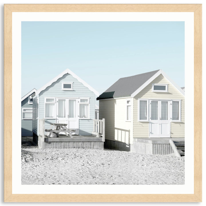 Framed Print: Beach Huts II is a modern coastal image of wooden beach huts in pastel colours. Suitable for Hamptons, Boho, beach or contemporary interiors, Beach Huts II will bring the tranquility of the beach into your space. Beach Huts II is printed on high quality pearlescent photography paper that provides exceptional image quality with enormously detailed sharpness and vivid colour. Image is printed with an unprinted border and the piece is assembled with a high quality open grain stained timber or matt composite moulding, 2mm acrylic glass and no matt board, with D-Rings and strung with cord ready to hang. Australian made under an Australian Made Campaign Ltd licence.