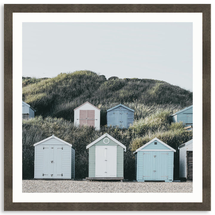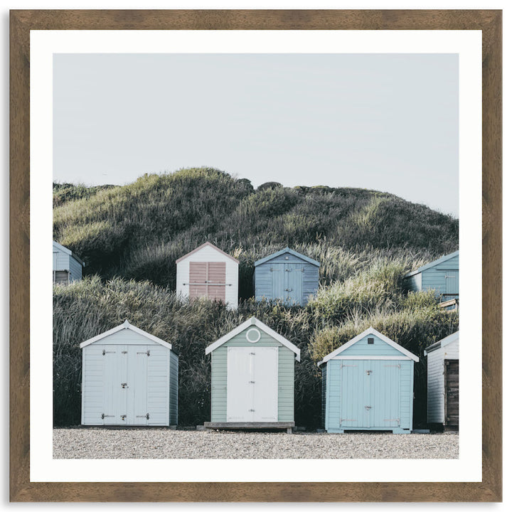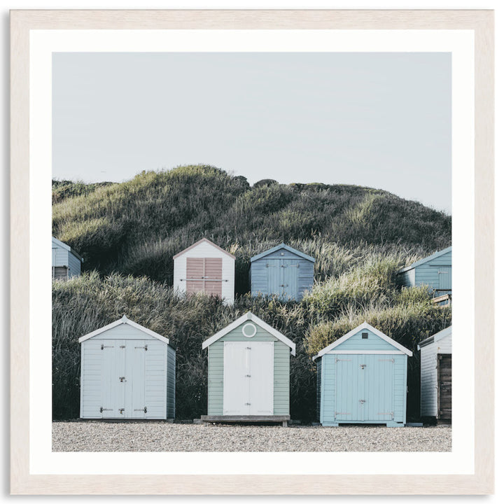 Framed Print: Beach Huts III is a modern coastal image of colourful wooden beach cabins. Suitable for Hamptons, Boho, beach or contemporary interiors, Beach Huts III will keep the memories of Summer holidays lasting year long. Beach Huts III is the first in a series of two and is printed on high quality pearlescent photography paper that provides exceptional image quality with enormously detailed sharpness and vivid colour. Image is printed with an unprinted border and the piece is assembled with a high quality open grain stained timber or matt composite moulding, 2mm acrylic glass and no matt board, with D-Rings and strung with cord ready to hang. Australian made under an Australian Made Campaign Ltd licence.