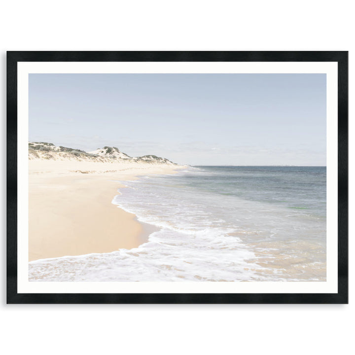 Framed Print: Belvidere Shoreline I is a coastal landscape with waves lazily lapping the beach. Belvidere Shoreline I will complement an Australian Coastal decor, taking inspiration from the glorious Australian coastline with stunning pristine beaches. Belvidere Shoreline I invokes feelings of calm and happiness and memories of beach vacations. Belvidere Shoreline I is printed on high quality pearlescent photography paper that provides exceptional image quality with enormously detailed sharpness and vivid colour. Image is printed with an unprinted border and the piece is assembled with a high quality open grain stained timber or matt composite moulding, 2mm acrylic glass and no matt board, with D-Rings and strung with cord ready to hang. Australian made under an Australian Made Campaign Ltd licence.