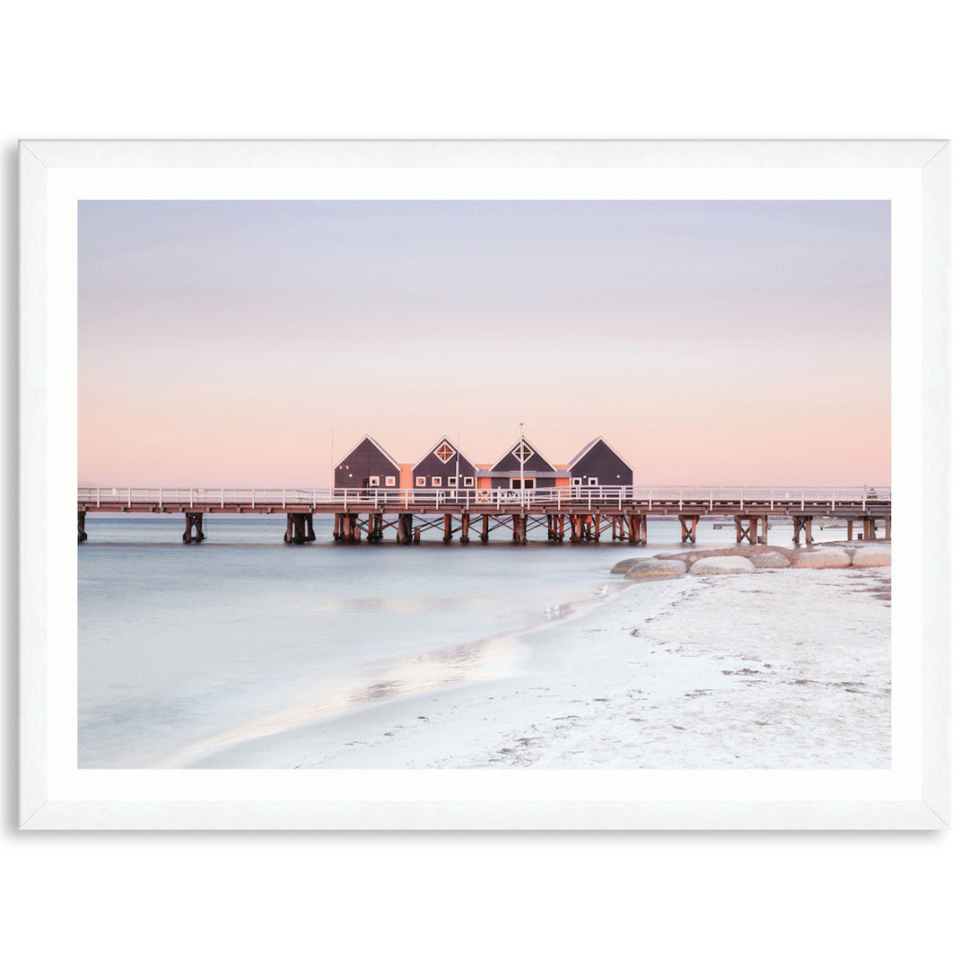 Framed Print: Busselton Jetty I is a contemporary coastal image of a magical sunset over a wooden jetty. The pastel colours of the sunset over water evokes feelings of calmness and harmony. Busselton Jetty is printed on high quality pearlescent photography paper that provides exceptional image quality with enormously detailed sharpness and vivid colour. Image is printed with an unprinted border and the piece is assembled with a high quality open grain stained timber or matt composite moulding, 2mm acrylic glass and no matt board, with D-Rings and strung with cord ready to hang. Australian made under an Australian Made Campaign Ltd licence.