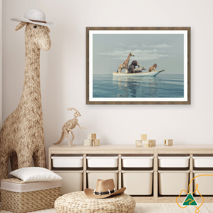 Framed Print: Exploration I is a modern unique image of four animals in a boat at sea. A lion, a rhino, an elephant and a giraffe taking a sea voyage is fun and suitable for children's interior spaces. Evoking feelings of nature and wildlife, Exploration I is playful and brings a sense of adventure. The neutral grey-blue tones of Exploration I is calming and will suit a variety of decor styles. Exploration III is printed on high quality pearlescent photography paper that provides exceptional image quality with enormously detailed sharpness and vivid colour. Image is printed with an unprinted border and the piece is assembled with a high quality open grain stained timber or matt composite moulding, 2mm acrylic glass and no matt board, with D-Rings and strung with cord ready to hang. Australian made under an Australian Made Campaign Ltd licence.