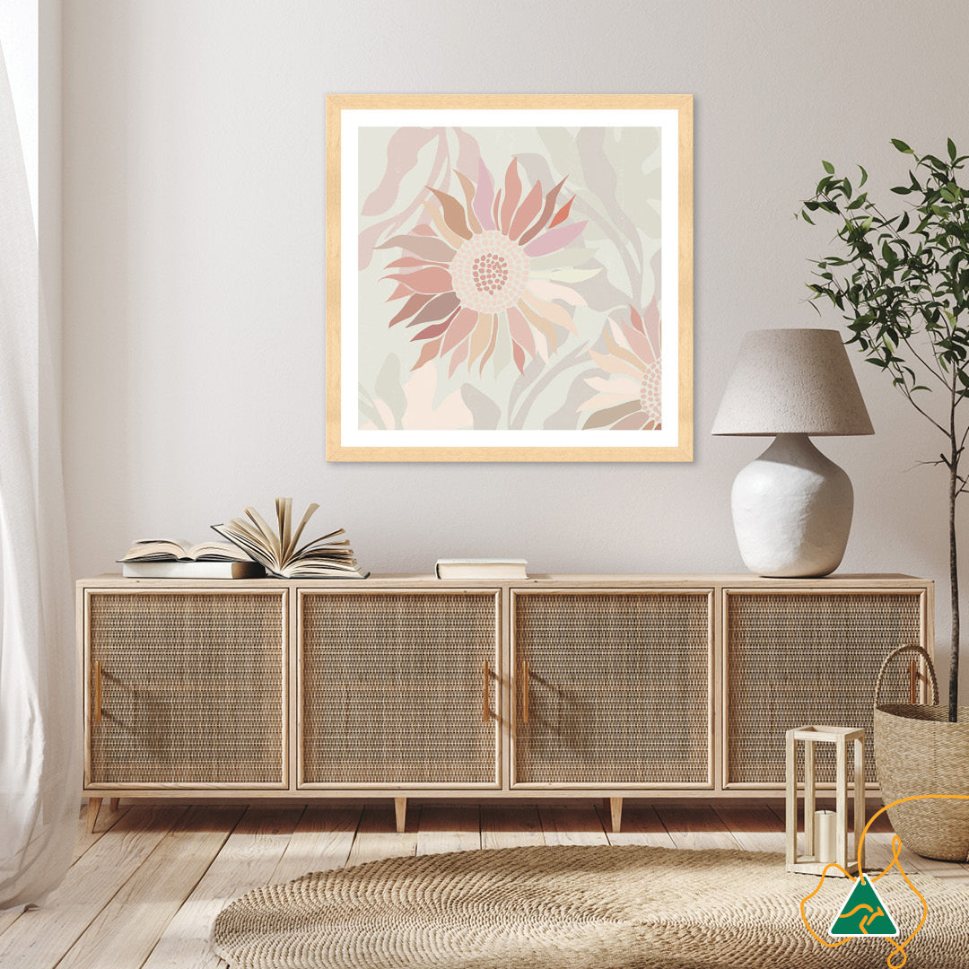 Framed Print: Flannel Blush III is a modern Australian flower-scape in soft blush tones. Be inspired by the beauty of mother nature and the soft foliage of Australian flora. Flannel Blush III is a contemporary floral graphic that is feminine, welcoming and cheerful. Flannel Blush III is the first in a series of two and is printed on high quality pearlescent photography paper that provides exceptional image quality with enormously detailed sharpness and vivid colour. Image is printed with an unprinted border and the piece is assembled with a high quality open grain stained timber or matt composite moulding, 2mm acrylic glass and no matt board, with D-Rings and strung with cord ready to hang. Australian made under an Australian Made Campaign Ltd licence.