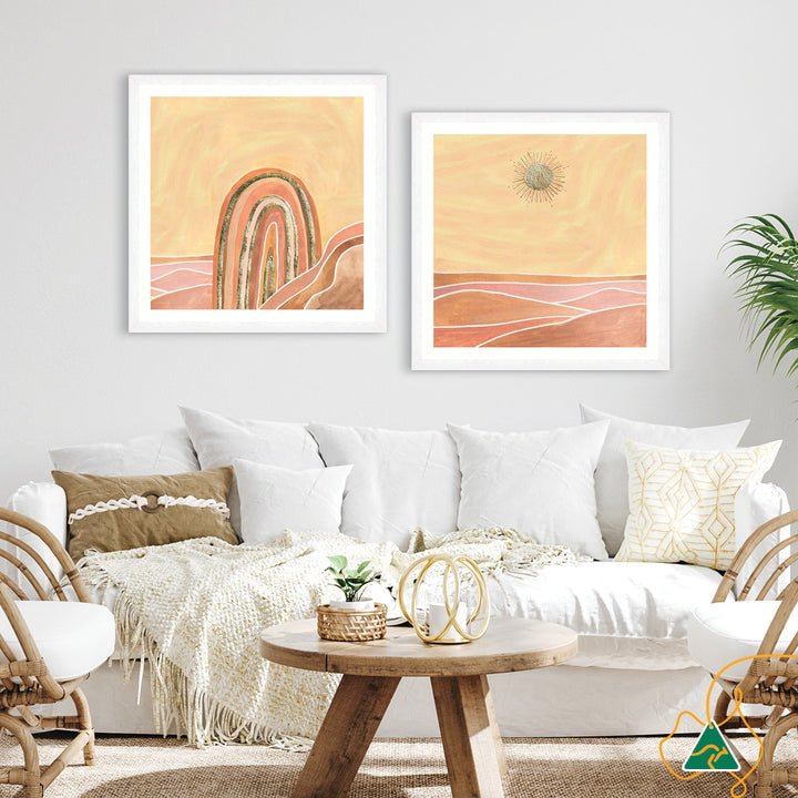 Framed Print: Golden Sky III is an abstract desert landscape in muted, earthy tones. Golden Sky III is a modern Bohemian watercolour with a golden rainbow in a paint texture effect. Golden Sky III is the second in a series of two designs and is printed on high quality pearlescent photography paper that provides exceptional image quality with enormously detailed sharpness and vivid colour. Image is printed with an unprinted border and the piece is assembled with a high quality open grain stained timber or matt composite moulding, 2mm acrylic glass and no matt board, with D-Rings and strung with cord ready to hang. Australian made under an Australian Made Campaign Ltd licence.