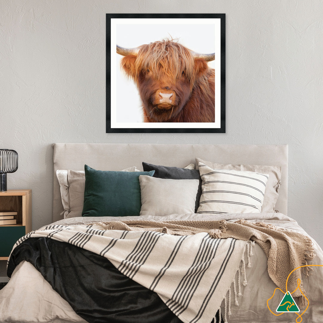 Framed Print: Hamish II is a contemporary portrait of a Highland cow in russet tones. Hamish II will make a fun and stylish wildlife addition to rustic interiors. Hamish II is printed on high quality pearlescent photography paper that provides exceptional image quality with enormously detailed sharpness and vivid colour. Image is printed with an unprinted border and the piece is assembled with a high quality open grain stained timber or matt composite moulding, 2mm acrylic glass and no matt board, with D-Rings and strung with cord ready to hang. Australian made under an Australian Made Campaign Ltd licence.