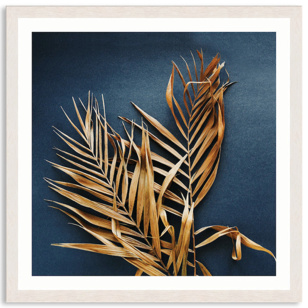 Framed Print: Luxe Floral III is a contemporary botanical design of dried palm leaves on a dark blue background. The golden hues will compliment other natural timber elements in your decor. Luxe Floral III is the second in a series of two and is printed on high quality pearlescent photography paper that provides exceptional image quality with enormously detailed sharpness and vivid colour. Image is printed with an unprinted border and the piece is assembled with a high quality open grain stained timber or matt composite moulding, 2mm acrylic glass and no matt board, with D-Rings and strung with cord ready to hang. Australian made under an Australian Made Campaign Ltd licence.