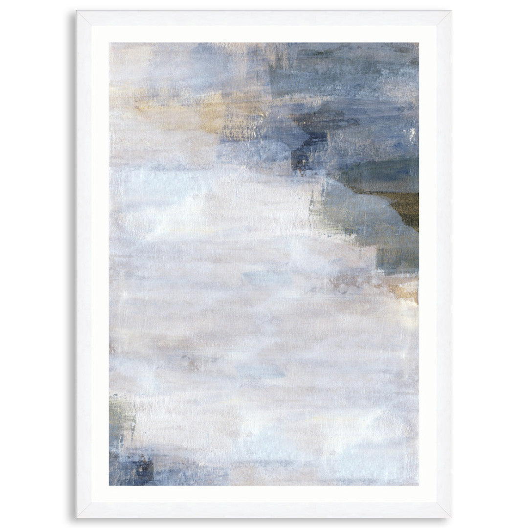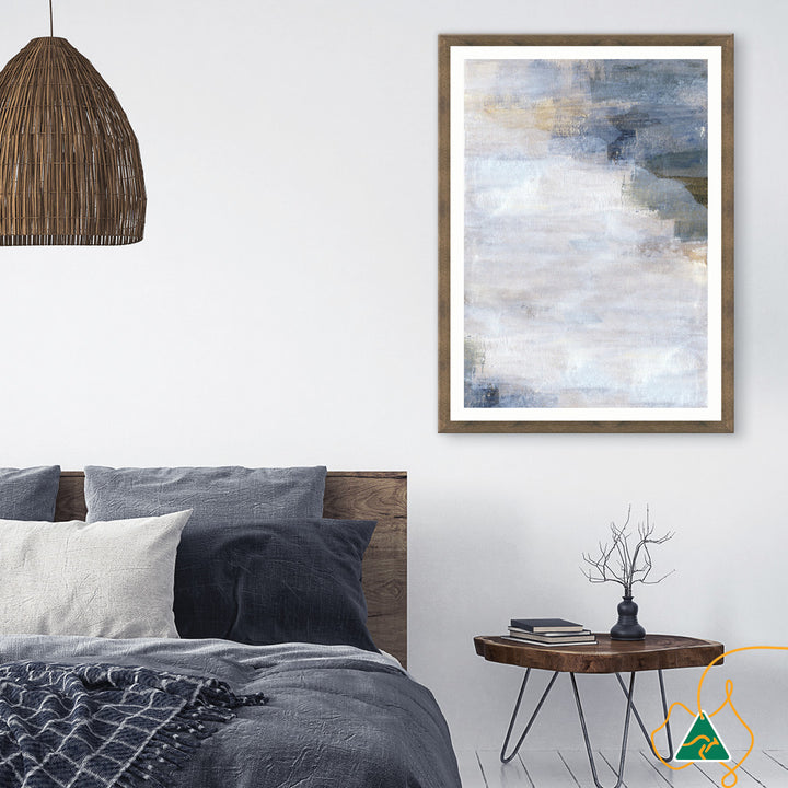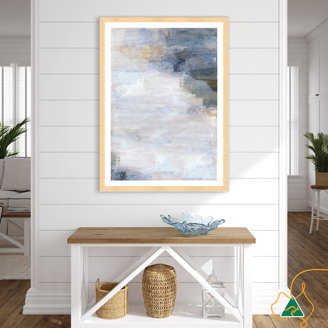 Framed Print: Neutral Bliss I is an abstract image taking inspiration from light reflected on a blue pond. Neutral Bliss I is a decorative piece of painted brushstrokes in blue and golden tones. Neutral Bliss is printed on high quality pearlescent photography paper that provides exceptional image quality with enormously detailed sharpness and vivid colour. Image is printed with an unprinted border and the piece is assembled with a high quality open grain stained timber or matt composite moulding, 2mm acrylic glass and no matt board, with D-Rings and strung with cord ready to hang. Australian made under an Australian Made Campaign Ltd licence.