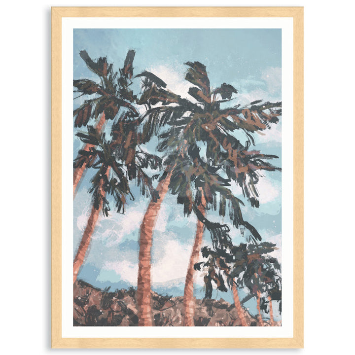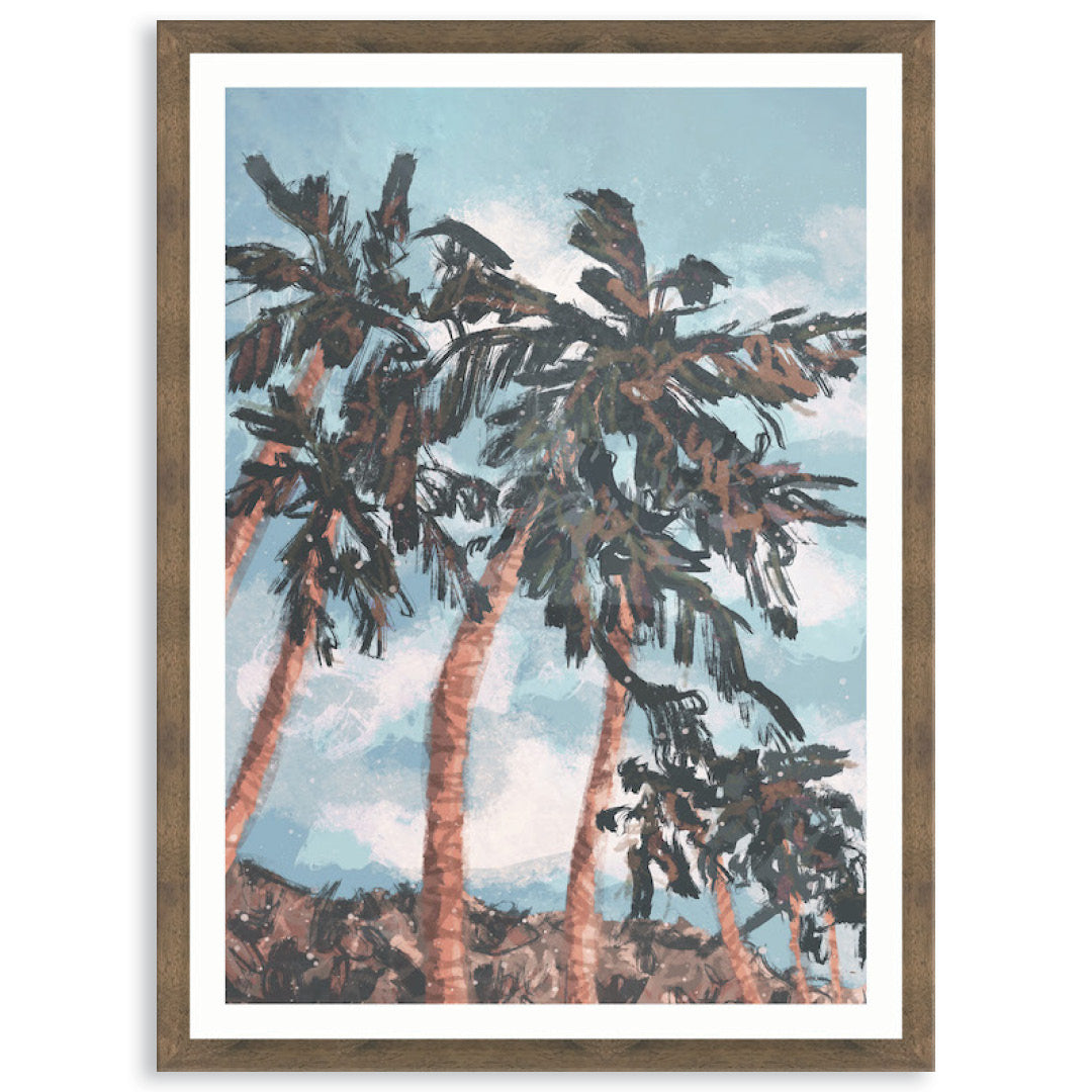 Framed Print: Palm Beach I is a modern tropical landscape of palm trees with an aqua sky. Be transported to the relaxed atmosphere of a tropical island. Palm Beach I is a contemporary graphic and is printed on high quality pearlescent photography paper that provides exceptional image quality with enormously detailed sharpness and vivid colour. Image is printed with an unprinted border and the piece is assembled with a high quality open grain stained timber or matt composite moulding, 2mm acrylic glass and no matt board, with D-Rings and strung with cord ready to hang. Australian made under an Australian Made Campaign Ltd licence.