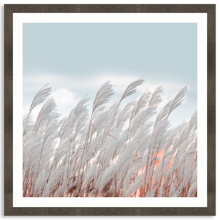 Framed Print: Silver Grass II is a contemporary coastal image in blue, silver and blush tones. The fluffy pampas grasses blowing in the breeze, against a pastel sky, evoke a sense of calm and tranquility. Silver Grass allows you to connect with nature and provide a private escape from the busy world outside. Silver Grass is printed on high quality pearlescent photography paper that provides exceptional image quality with enormously detailed sharpness and vivid colour. Image is printed with an unprinted border and the piece is assembled with a high quality open grain stained timber or matt composite moulding, 2mm acrylic glass and no matt board, with D-Rings and strung with cord ready to hang. Australian made under an Australian Made Campaign Ltd licence.