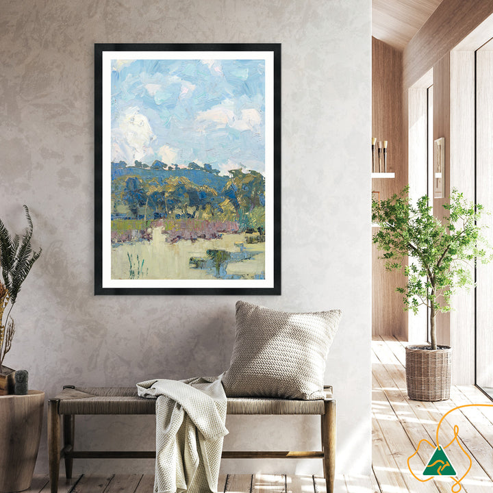 Framed Print: Rural Pond I is a contemporary painted landscape with tree-lined hills overlooking a country pond. Rural Pond has a light summery feel and is printed on high quality pearlescent photography paper that provides exceptional image quality with enormously detailed sharpness and vivid colour. Image is printed with an unprinted border and the piece is assembled with a high quality open grain stained timber or matt composite moulding, 2mm acrylic glass and no matt board, with D-Rings and strung with cord ready to hang. Australian made under an Australian Made Campaign Ltd licence.