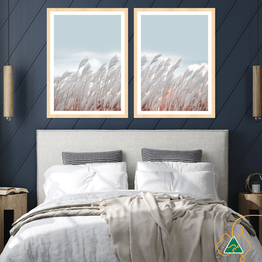 Framed Print: Silver Grass IV is a contemporary coastal image in blue, silver and blush tones. The fluffy pampas grasses blowing in the breeze, against a pastel sky, evoke a sense of calm and tranquility. Silver Grass allows you to connect with nature and provide a private escape from the busy world outside. Silver Grass IV is the second in a series of two designs and is printed on high quality pearlescent photography paper that provides exceptional image quality with enormously detailed sharpness and vivid colour. Image is printed with an unprinted border and the piece is assembled with a high quality open grain stained timber or matt composite moulding, 2mm acrylic glass and no matt board, with D-Rings and strung with cord ready to hang. Australian made under an Australian Made Campaign Ltd licence.