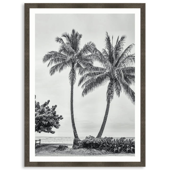 Framed Print: Waikiki Beach I is a contemporary monochromatic tropical seascape. Evoke the feeling of ease and relaxation by bringing inside the natural beauty of a coastal view. This black and white image will create a dramatic focal point and create a sense of understated luxurious living. Waikiki Beach I is printed on high quality pearlescent photography paper that provides exceptional image quality with enormously detailed sharpness and vivid colour. Image is printed with an unprinted border and the piece is assembled with a high quality open grain stained timber or matt composite moulding, 2mm acrylic glass and no matt board, with D-Rings and strung with cord ready to hang. Australian made under an Australian Made Campaign Ltd licence.