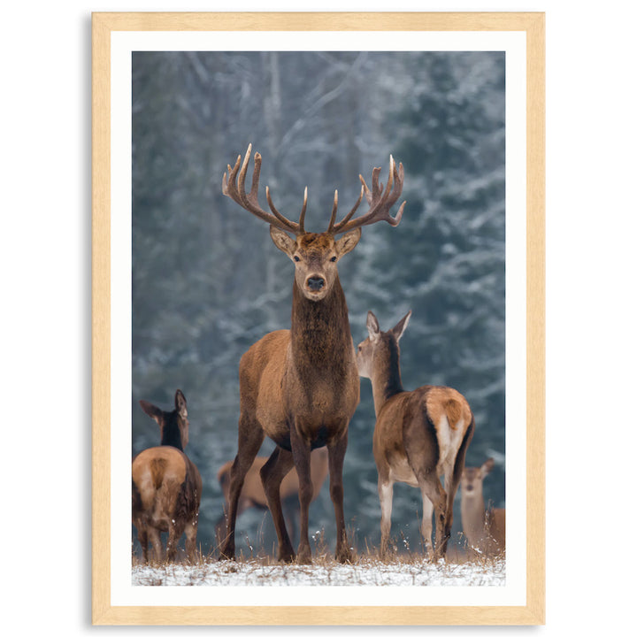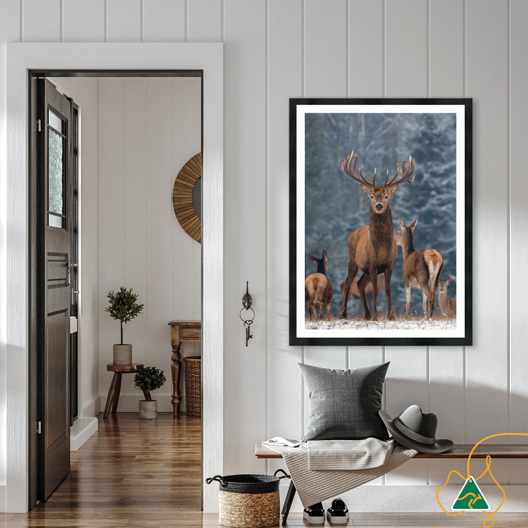 Framed Print: Sentinel IV is a stunning portrait of a Stag and deer herd with a birch forest backdrop. The versatile neutral grey and brown tones of Sentinel IV will add a rustic charm to your interior decor. Sentinel IV has a peaceful quality and is the first in a series of two designs. Sentinel IV is printed on high quality pearlescent photography paper that provides exceptional image quality with enormously detailed sharpness and vivid colour. Image is printed with an unprinted border and the piece is assembled with a high quality open grain stained timber or matt composite moulding, 2mm acrylic glass and no matt board, with D-Rings and strung with cord ready to hang. Australian made under an Australian Made Campaign Ltd licence.