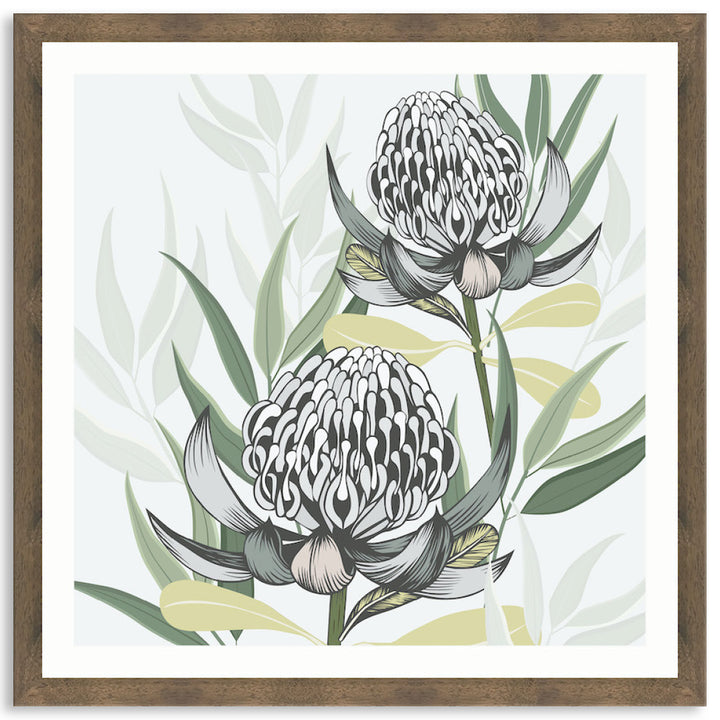 Framed Print: White Waratah II is a modern Australian floral design in soft grey and green tones. Be inspired by the beauty and elegance of Australian flora. White Waratah II is a contemporary graphic that is happy and welcoming. White Waratah II is printed on high quality pearlescent photography paper that provides exceptional image quality with enormously detailed sharpness and vivid colour. Image is printed with an unprinted border and the piece is assembled with a high quality open grain stained timber or matt composite moulding, 2mm acrylic glass and no matt board, with D-Rings and strung with cord ready to hang. Australian made under an Australian Made Campaign Ltd licence.