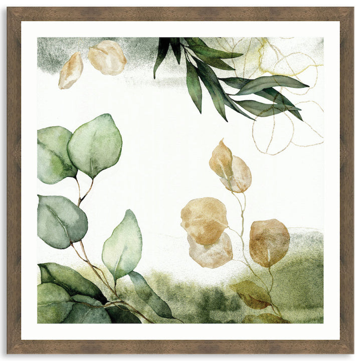 Framed Print: Woodland Stroll III is an abstract botanical with a watercolour effect. Add colour and interest to your decor with the green and gold tones of eucalypt leaves. Woodland Stroll III will elevate your interior space making it feel fresh, warm and inviting. Woodland Stroll III is the first in a series of two and is printed on high quality pearlescent photography paper that provides exceptional image quality with enormously detailed sharpness and vivid colour. Image is printed with an unprinted border and the piece is assembled with a high quality open grain stained timber or matt composite moulding, 2mm acrylic glass and no matt board, with D-Rings and strung with cord ready to hang. Australian made under an Australian Made Campaign Ltd licence.
