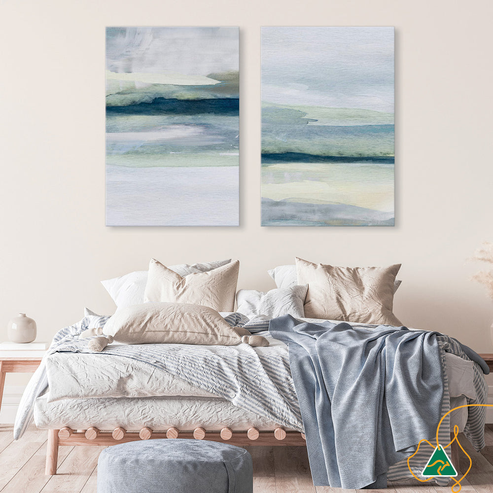 Canvas Print: Abstract Sea IV is a modern abstract seascape and the first in a series. The soft green and blue hues of this contemporary coastal watercolour, evokes a feeling of harmony and tranquility. Abstract Sea will add a touch of luxury to interior spaces and is printed on high quality glossy poly-cotton canvas featuring high whiteness and superior colour brilliance and image definition with UV stabilised solvent ink. The canvas is stretched over a sturdy support frame with D-Rings and strung with cord ready to hang. Australian made under an Australian Made Campaign Ltd licence.