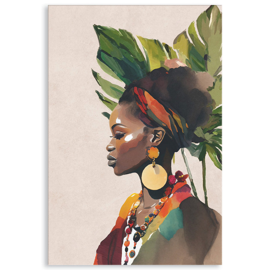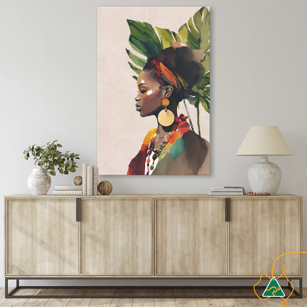 Canvas Print: Adana I is a contemporary portrait of an African woman with large gold earrings and headscarf. Adana I is a modern, eye-catching piece in watercolour muted tones with pops of red and turquoise. The palm leaves backdrop gives a warm, tropical feel to this exotic design. Adana I is printed on high quality glossy poly-cotton canvas featuring high whiteness and superior colour brilliance and image definition with UV stabilised solvent ink. The canvas is stretched over a sturdy support frame with D-Rings and strung with cord ready to hang. Australian made under an Australian Made Campaign Ltd licence.