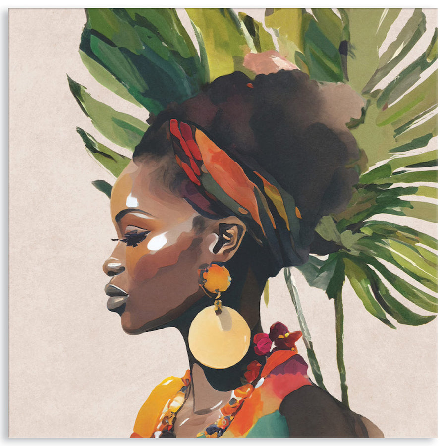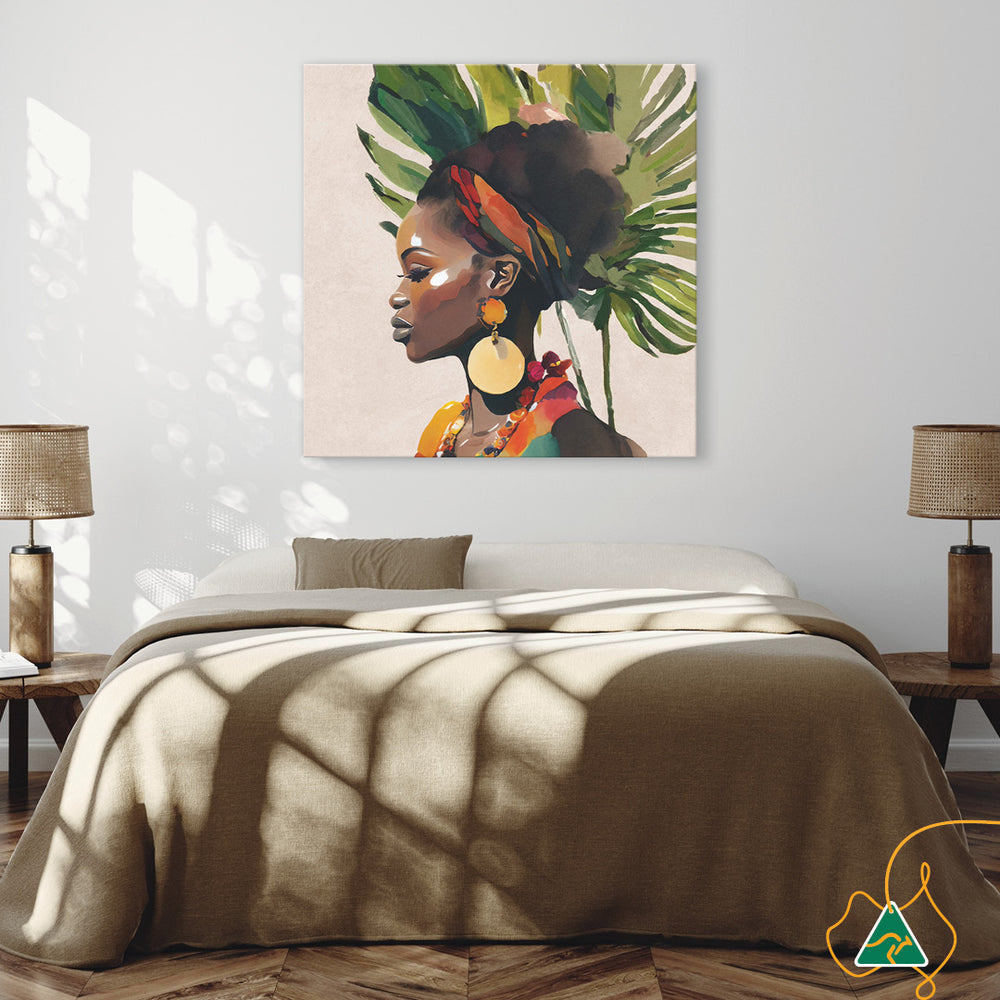 Canvas Print: Adana II is a contemporary portrait of an African woman with large gold earrings and headscarf. Adana II is a modern, eye-catching piece in watercolour muted tones with pops of red and turquoise. The palm leaves backdrop gives a warm, tropical feel to this exotic design. Adana II is printed on high quality glossy poly-cotton canvas featuring high whiteness and superior colour brilliance and image definition with UV stabilised solvent ink. The canvas is stretched over a sturdy support frame with D-Rings and strung with cord ready to hang. Australian made under an Australian Made Campaign Ltd licence.