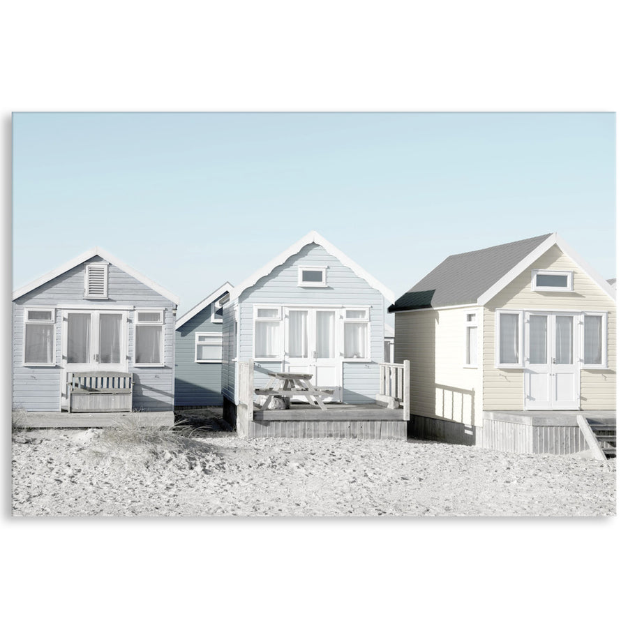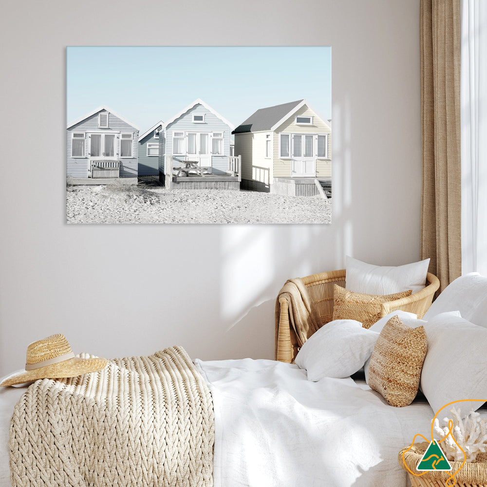 Canvas Print: Beach Huts I is a modern coastal image of wooden beach huts in pastel colours. Suitable for Hamptons, Boho, beach or contemporary interiors, Beach Huts I will bring the tranquility of the beach into your space. Beach Huts I is printed on high quality glossy poly-cotton canvas featuring high whiteness and superior colour brilliance and image definition with UV stabilised solvent ink. The canvas is stretched over a sturdy support frame with D-Rings and strung with cord ready to hang. Australian made under an Australian Made Campaign Ltd licence.