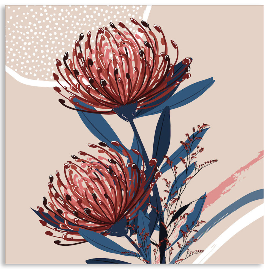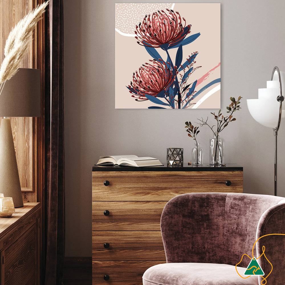 Canvas Print: Blush Foliage IV is a modern botanical, inspired by the Australian Waratah. Blush Foliage IV is a contemporary graphic and is printed on high quality glossy poly-cotton canvas featuring high whiteness and superior colour brilliance and image definition with UV stabilised solvent ink. The canvas is stretched over a sturdy support frame with D-Rings and strung with cord ready to hang. Australian made under an Australian Made Campaign Ltd licence.