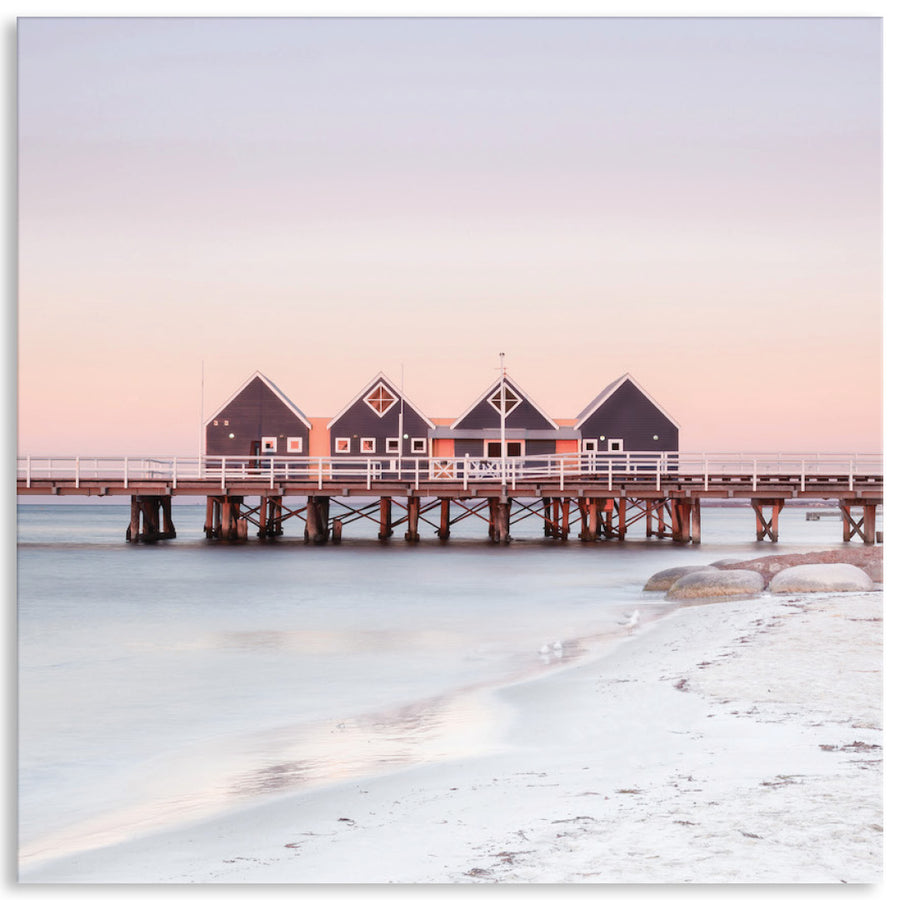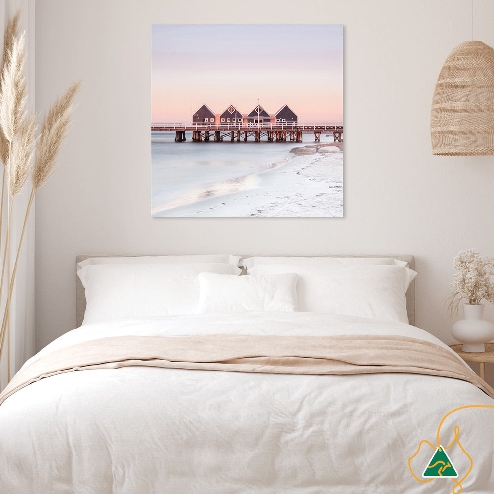 Canvas Print: Busselton Jetty II is a contemporary coastal image of a magical sunset over a wooden jetty. The pastel colours of the sunset over water evokes feelings of calmness and harmony. Busselton Jetty is printed on high quality glossy poly-cotton canvas featuring high whiteness and superior colour brilliance and image definition with UV stabilised solvent ink. The canvas is stretched over a sturdy support frame with D-Rings and strung with cord ready to hang. Australian made under an Australian Made Campaign Ltd licence.