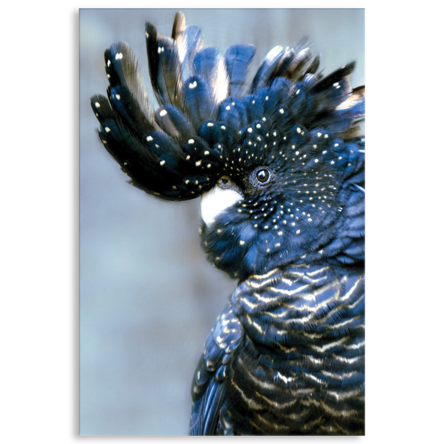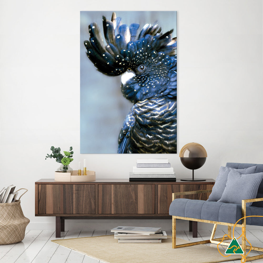 Canvas Print: Cockatoo Black I is a modern portrait of an Australian Black Cockatoo in blue and golden tones. Cockatoo Black I is a striking image and conjures opulence and luxury. Cockatoo Black is printed on high quality glossy poly-cotton canvas featuring high whiteness and superior colour brilliance and image definition with UV stabilised solvent ink. The canvas is stretched over a sturdy support frame with D-Rings and strung with cord ready to hang. Australian made under an Australian Made Campaign Ltd licence