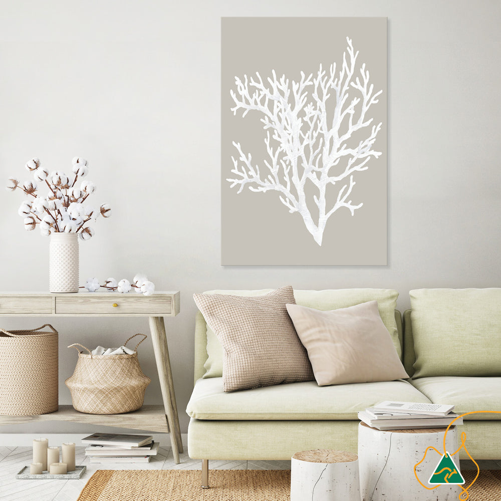 Canvas Print: Coral Focus II is a contemporary image in neutral, natural tones with the coral having a painted effect. Coral Focus II will bring a coastal relaxed feel to your interior spaces. It has a light and airy feel suitable for a Hamptons decor. Coral Focus II is printed on high quality glossy poly-cotton canvas featuring high whiteness and superior colour brilliance and image definition with UV stabilised solvent ink. The canvas is stretched over a sturdy support frame with D-Rings and strung with cord ready to hang. Australian made under an Australian Made Campaign Ltd licence.