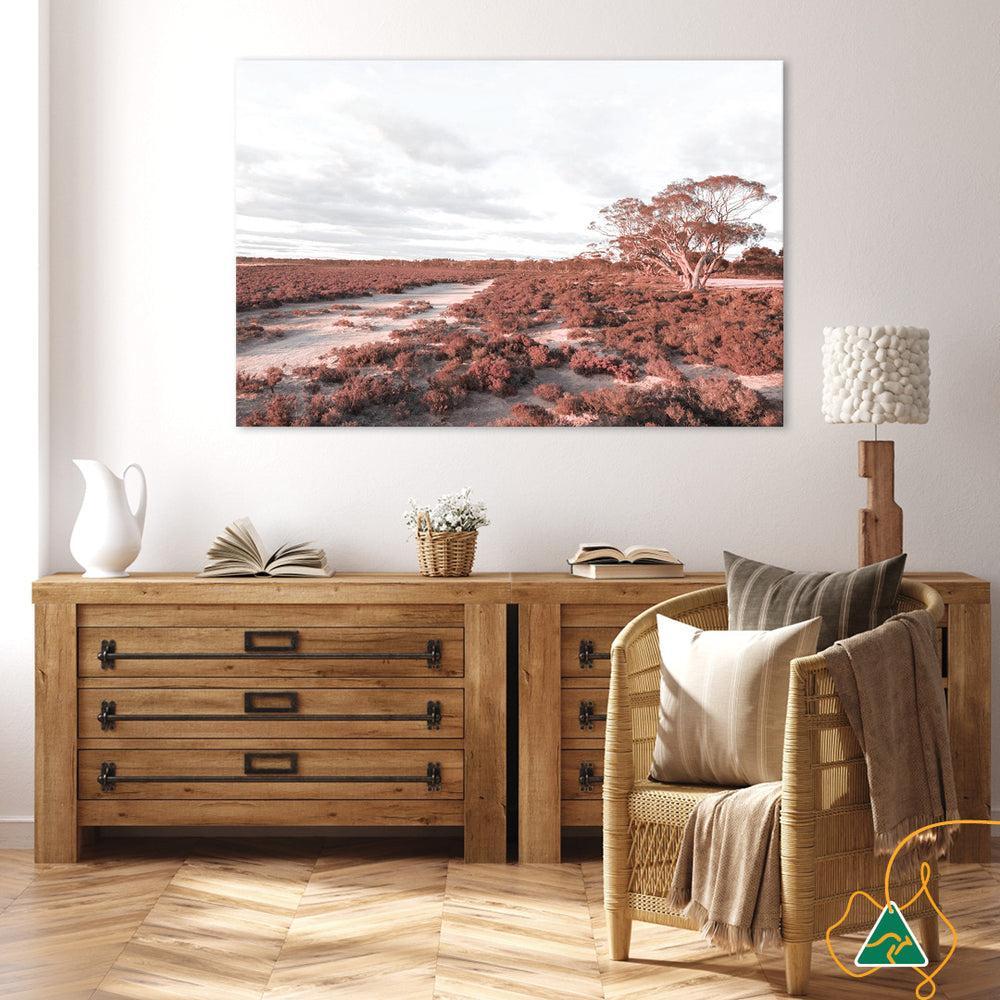 Canvas Print: Desert Sunset I is a contemporary landscape showcasing the native Australian desert at sunset. Modern Australiana interiors, based on neutral tones and natural materials, will be complemented with the warm earthy reds of the desert landscape. Desert Sunset is printed on high quality glossy poly-cotton canvas featuring high whiteness and superior colour brilliance and image definition with UV stabilised solvent ink. The canvas is stretched over a sturdy support frame with D-Rings and strung with cord ready to hang. Australian made under an Australian Made Campaign Ltd licence.