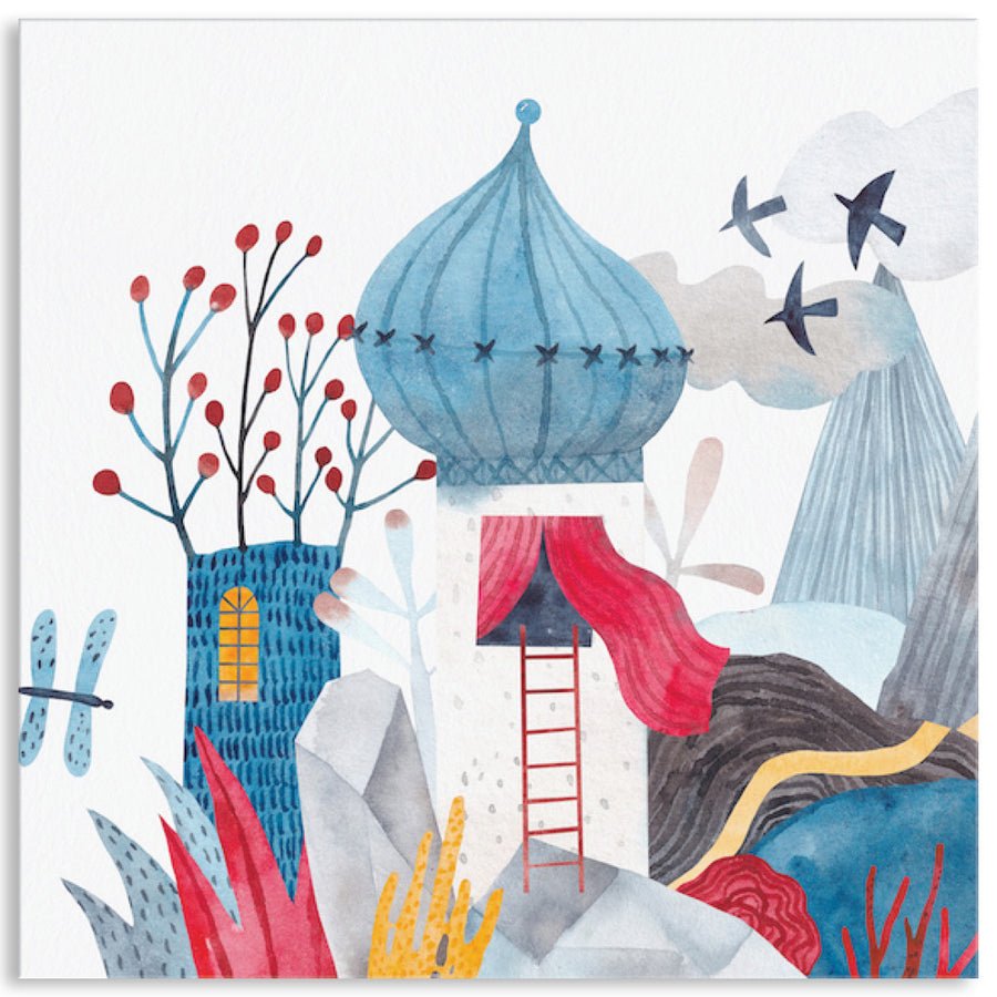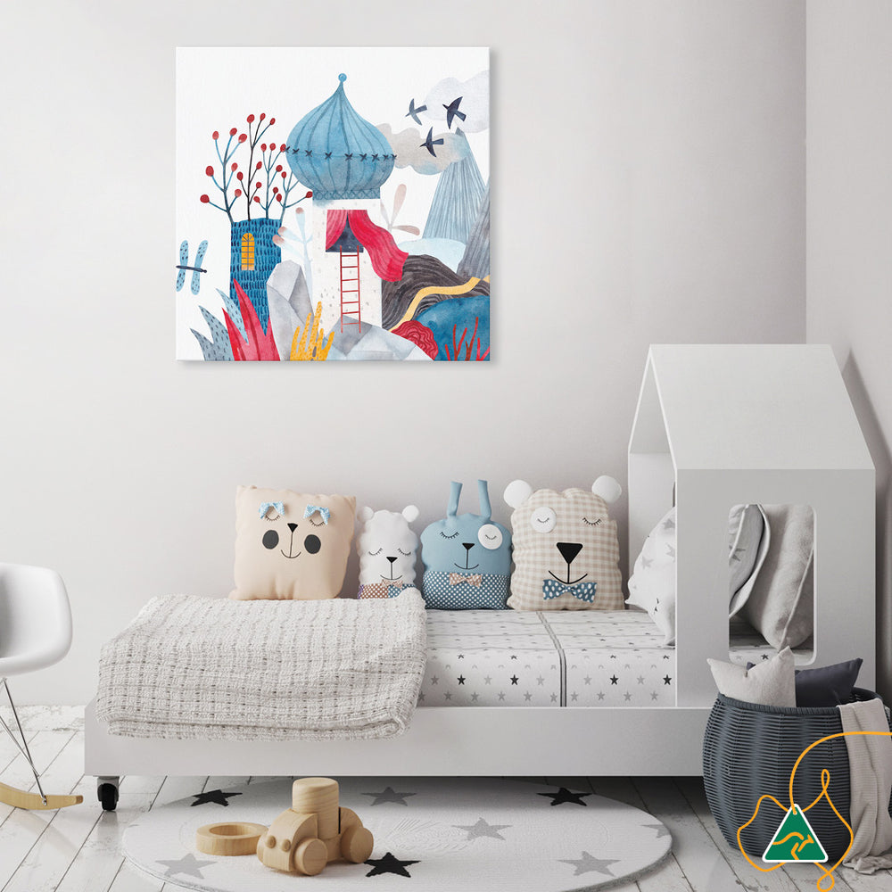 Canvas Print: Fantasy Castle II is a contemporary watercolour illustration of a fairytale castle. The first in a series of two designs, Fantasy Castle II will create charm and fun in children's interior spaces. Fantasy Castle II is in soft red, white and blue tones and will enchant and stir the imagination. Fantasy Castle II is printed on high quality glossy poly-cotton canvas featuring high whiteness and superior colour brilliance and image definition with UV stabilised solvent ink. The canvas is stretched over a sturdy support frame with D-Rings and strung with cord ready to hang. Australian made under an Australian Made Campaign Ltd licence.