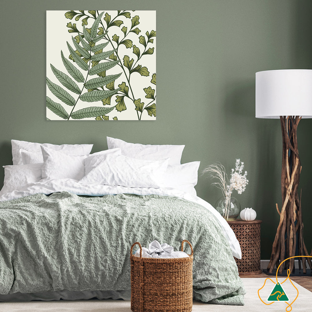 Canvas Print: Fern Study IV is a modern botanical, inspired by the foliage of the Australian Tree Fern. Muted green Fern Fronds are isolated on a neutral background. Fern Study IV is a contemporary graphic and is printed on high quality glossy poly-cotton canvas featuring high whiteness and superior colour brilliance and image definition with UV stabilised solvent ink. The canvas is stretched over a sturdy support frame with D-Rings and strung with cord ready to hang. Australian made under an Australian Made Campaign Ltd licence.