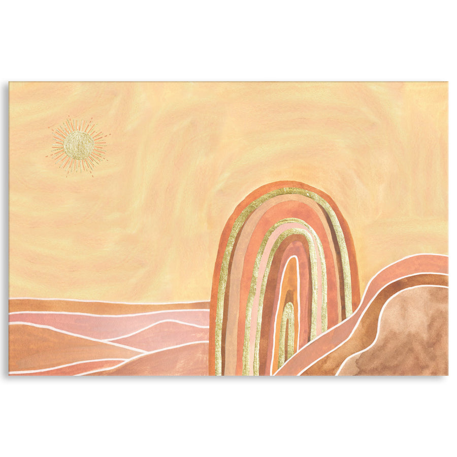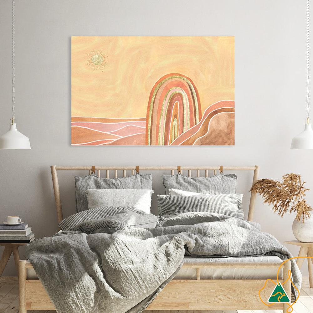Canvas Print: Golden Sky I is an abstract desert landscape in muted, earthy tones. Golden Sky is a modern Bohemian watercolour with a golden sun and rainbow in paint texture effect. Golden Sky I is printed on high quality glossy poly-cotton canvas featuring high whiteness and superior colour brilliance and image definition with UV stabilised solvent ink. The canvas is stretched over a sturdy support frame with D-Rings and strung with cord ready to hang. Australian made under an Australian Made Campaign Ltd licence.