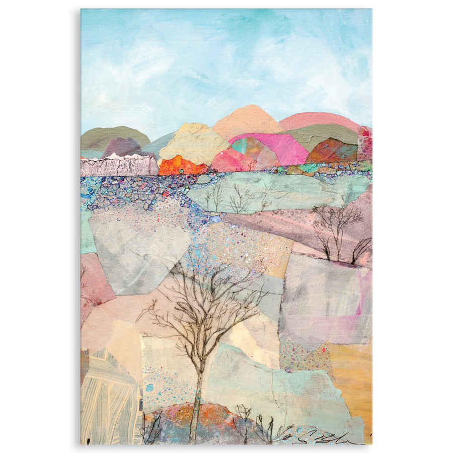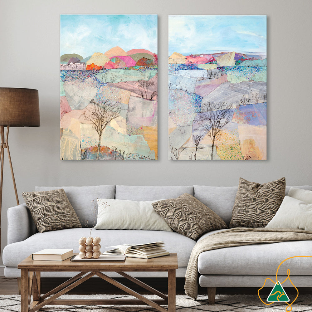 Canvas Print: In My Mind's Eye I is a modern abstract painted landscape by a NSW south coast artist and is the first in a series of four eye-catching pastoral designs. In My Mind's Eye I is an organic, contemporary rural vista, evoking feelings of harmony and tranquility. Bring the magic of rolling hills and gently sloping pastures inside with this unique design. In My Minds's Eye will bring colour and playfulness to interior spaces and is printed on high quality glossy poly-cotton canvas featuring high whiteness and superior colour brilliance and image definition with UV stabilised solvent ink. The canvas is stretched over a sturdy support frame with D-Rings and strung with cord ready to hang. Australian made under an Australian Made Campaign Ltd licence.