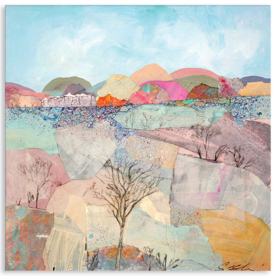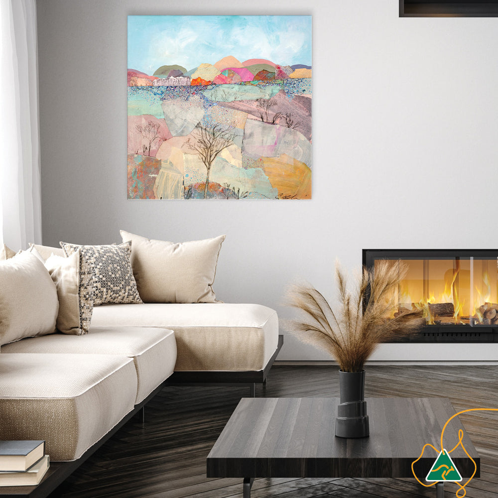Canvas Print: In My Mind's Eye II is a modern abstract painted landscape by a NSW south coast artist and is the first in a series of four eye-catching pastoral designs. In My Mind's Eye II is an organic, contemporary rural vista, evoking feelings of harmony and tranquility. Bring the magic of rolling hills and gently sloping pastures inside with this unique design. In My Minds's Eye will bring colour and playfulness to interior spaces and is printed on high quality glossy poly-cotton canvas featuring high whiteness and superior colour brilliance and image definition with UV stabilised solvent ink. The canvas is stretched over a sturdy support frame with D-Rings and strung with cord ready to hang. Australian made under an Australian Made Campaign Ltd licence.