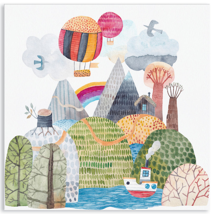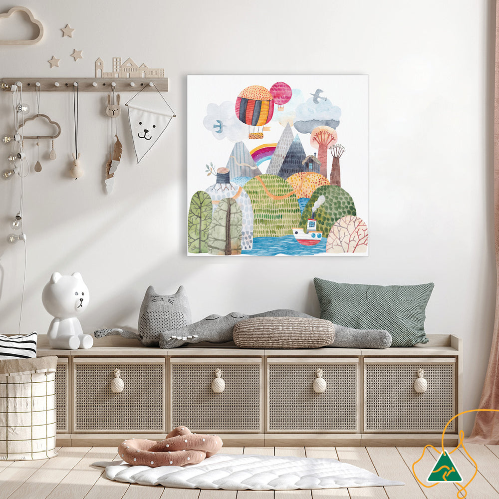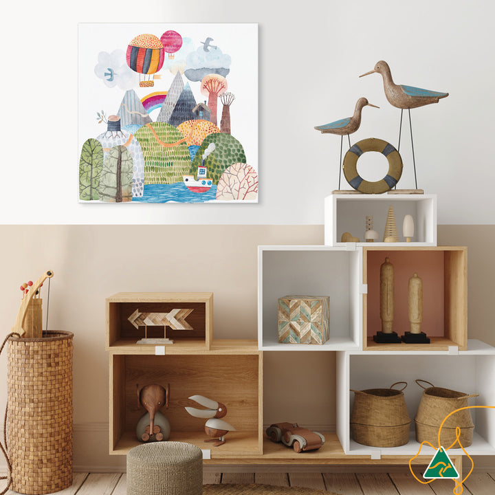 Canvas Print: Mountain Trail IV is a playful watercolour landscape illustration. This fun country landscape is suitable for children's interior spaces and evokes feelings of positivity and adventure. Mountain Trail IV is the second in a series of two designs that will bring the outside in and create a fun connection with the natural world. Mountain Trail IV is printed on high quality glossy poly-cotton canvas featuring high whiteness and superior colour brilliance and image definition with UV stabilised solvent ink. The canvas is stretched over a sturdy support frame with D-Rings and strung with cord ready to hang. Australian made under an Australian Made Campaign Ltd licence.