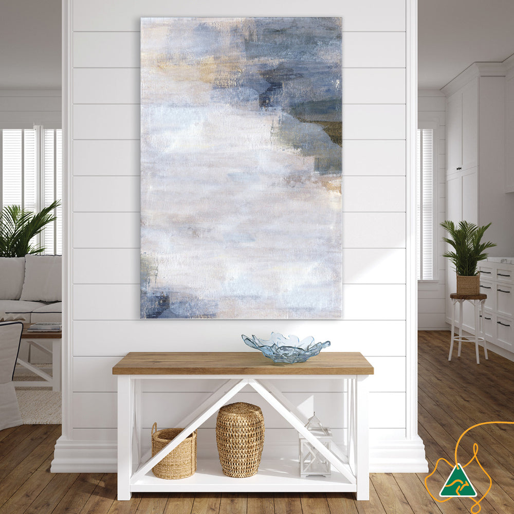 Canvas Print: Neutral Bliss I is an abstract image taking inspiration from light reflected on a blue pond. Neutral Bliss I is a decorative piece of painted brushstrokes in blue and golden tones. Neutral Bliss is printed on high quality glossy poly-cotton canvas featuring high whiteness and superior colour brilliance and image definition with UV stabilised solvent ink. The canvas is stretched over a sturdy support frame with D-Rings and strung with cord ready to hang. Australian made under an Australian Made Campaign Ltd licence.