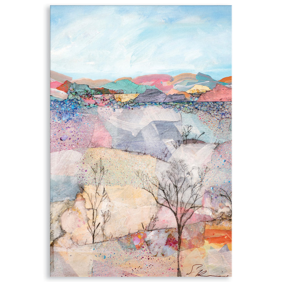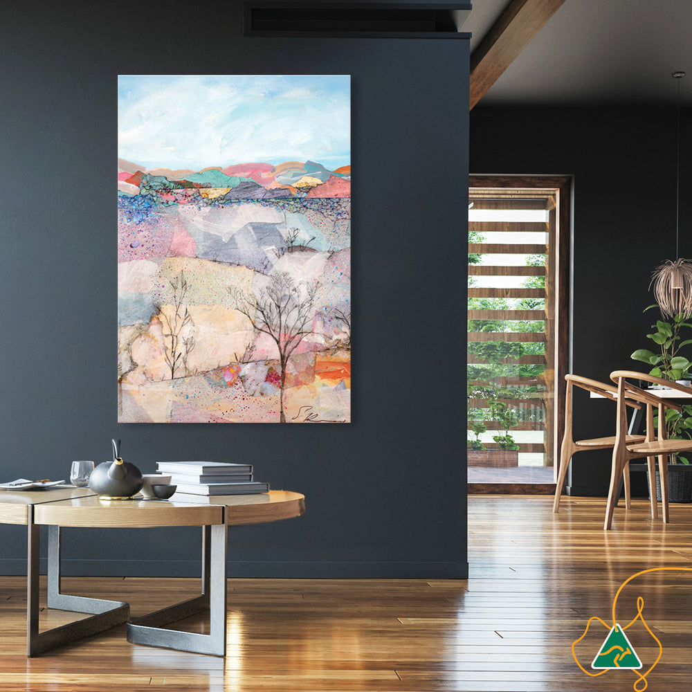 Canvas Print: New Found Treasures I is a modern abstract painted landscape by a NSW south coast artist and is the third in a series of four eye-catching pastoral designs. New Found Treasures I is an organic, contemporary rural vista, evoking feelings of harmony and tranquility. Bring the magic of rolling hills and gently sloping pastures inside with this unique design. New Found Treasures will bring colour and playfulness to interior spaces and is printed on high quality glossy poly-cotton canvas featuring high whiteness and superior colour brilliance and image definition with UV stabilised solvent ink. The canvas is stretched over a sturdy support frame with D-Rings and strung with cord ready to hang. Australian made under an Australian Made Campaign Ltd licence.