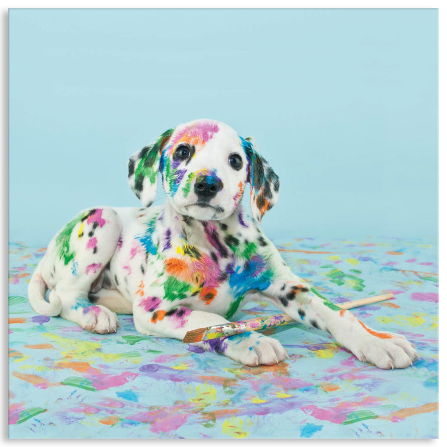 Canvas Print: Paint Pup IV is a modern image of a Dalmation pup on a pale blue background. This fun design shows the pup after a playful experience with colourful paint. Paint Pup IV is the first of two designs of this black and white pup. Paint Pup IV is suitable for children's interior spaces and is printed on high quality glossy poly-cotton canvas featuring high whiteness and superior colour brilliance and image definition with UV stabilised solvent ink. The canvas is stretched over a sturdy support frame with D-Rings and strung with cord ready to hang. Australian made under an Australian Made Campaign Ltd licence.