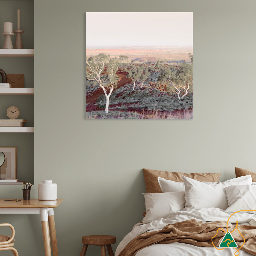 Canvas Print: Pilbara Skies II is a beautiful modern Australian landscape in earthy rust and green tones. The warm neutral colouring of the Australian Outback is welcoming and calming and will elevate your interior space. Pilbara Skies II brings the outdoors inside and is printed on high quality glossy poly-cotton canvas featuring high whiteness and superior colour brilliance and image definition with UV stabilised solvent ink. The canvas is stretched over a sturdy support frame with D-Rings and strung with cord ready to hang. Australian made under an Australian Made Campaign Ltd licence.