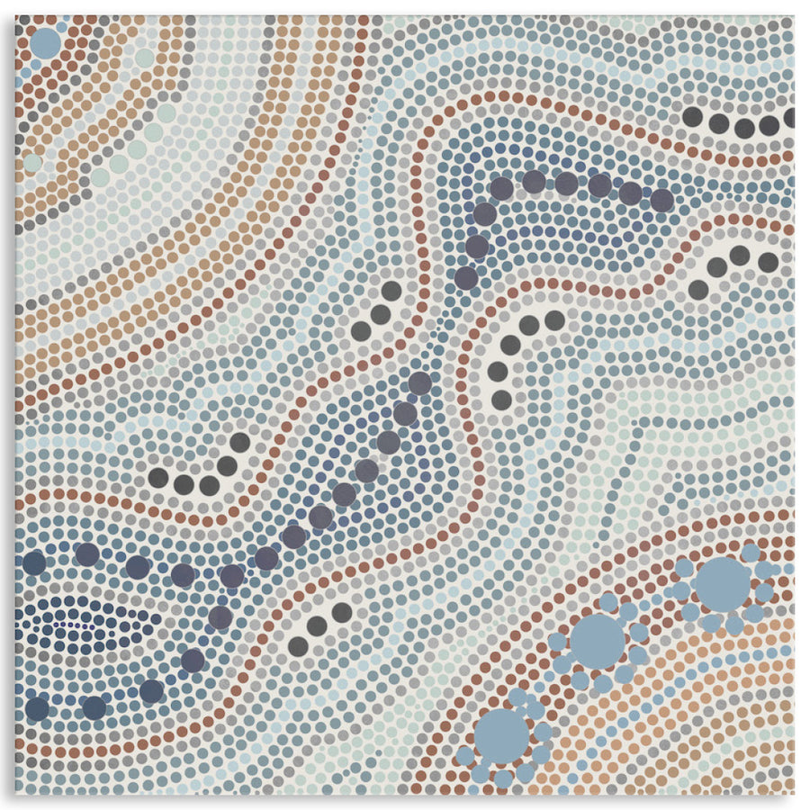 Canvas Print: River Silver II is an abstract dot-style design depicting a flowing river. This modern image in soft blue, grey and brown tones has a calming quality and would suit an Australiana decor with nature timber elements. River Silver II is a contemporary graphic and is printed on high quality glossy poly-cotton canvas featuring high whiteness and superior colour brilliance and image definition with UV stabilised solvent ink. The canvas is stretched over a sturdy support frame with D-Rings and strung with cord ready to hang. Australian made under an Australian Made Campaign Ltd licence.