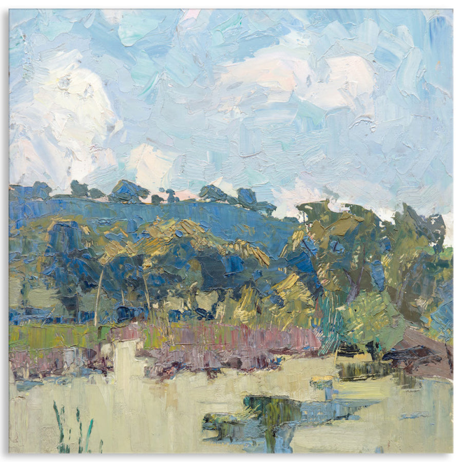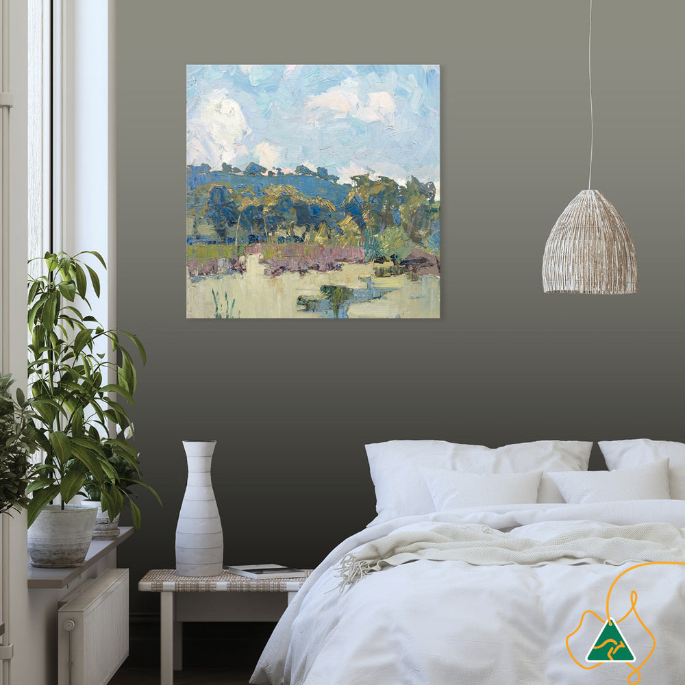 Canvas Print: Rural Pond II is a contemporary painted landscape with tree-lined hills overlooking a country pond. Rural Pond has a light summery feel and is printed on high quality glossy poly-cotton canvas featuring high whiteness and superior colour brilliance and image definition with UV stabilised solvent ink. The canvas is stretched over a sturdy support frame with D-Rings and strung with cord ready to hang. Australian made under an Australian Made Campaign Ltd licence.