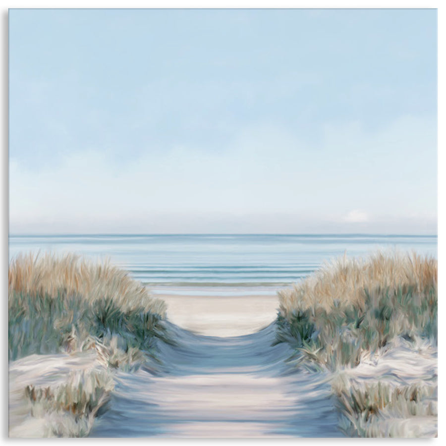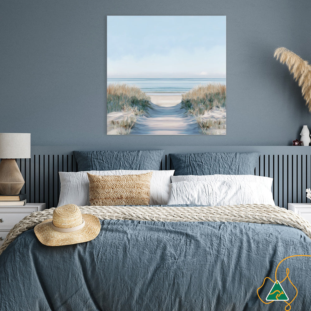 Canvas Print: Sandy Path II is a contemporary coastal painted landscape in pastel colours. The pathway through coastal grass to the beach and ocean invokes happiness of the great outdoors and memories of childhood holidays. Sandy Path II is a versatile design that can be incorporated into a Hamptons decor or a more relaxed coastal interior. Sandy Path II is printed on high quality glossy poly-cotton canvas featuring high whiteness and superior colour brilliance and image definition with UV stabilised solvent ink. The canvas is stretched over a sturdy support frame with D-Rings and strung with cord ready to hang. Australian made under an Australian Made Campaign Ltd licence.