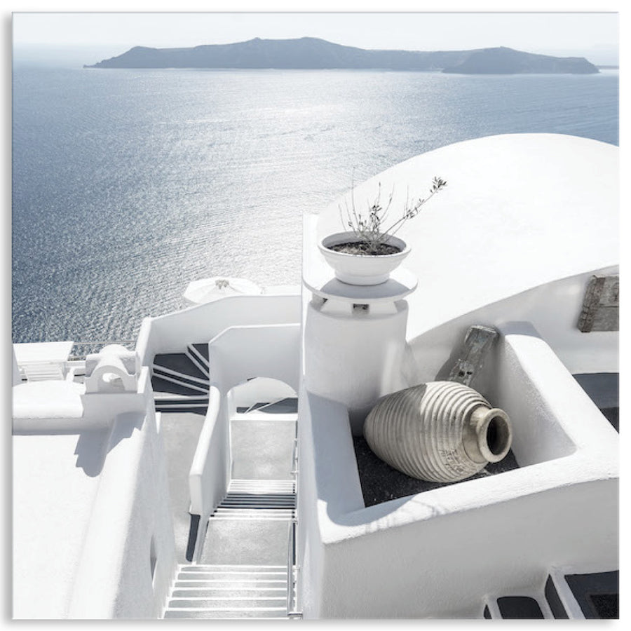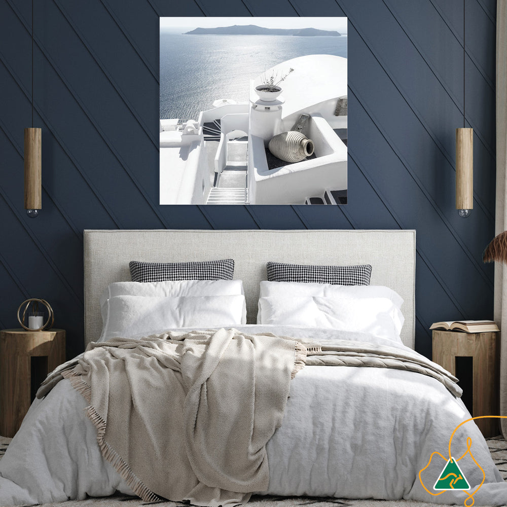 Canvas Print: Santorini Stairs II is a contemporary coastal image in blue and white neutral tones. Be inspired by Greek architecture in sparkling white and the blue waters of the Aegean Sea. Santorini Stairs II is bright and welcoming and is printed on high quality glossy poly-cotton canvas featuring high whiteness and superior colour brilliance and image definition with UV stabilised solvent ink. The canvas is stretched over a sturdy support frame with D-Rings and strung with cord ready to hang. Australian made under an Australian Made Campaign Ltd licence.