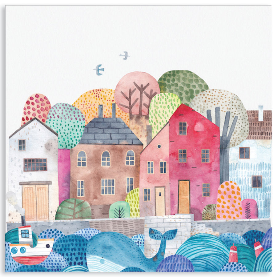 Canvas Print: Sea Port II is a contemporary watercolour seascape illustration. This fun interpretation of a seaside town, is suitable for children's interior spaces. Sea Port II is a playful nautical design, evoking a sense of calm and connection with the natural world. Sea Port II is printed on high quality glossy poly-cotton canvas featuring high whiteness and superior colour brilliance and image definition with UV stabilised solvent ink. The canvas is stretched over a sturdy support frame with D-Rings and strung with cord ready to hang. Australian made under an Australian Made Campaign Ltd licence.