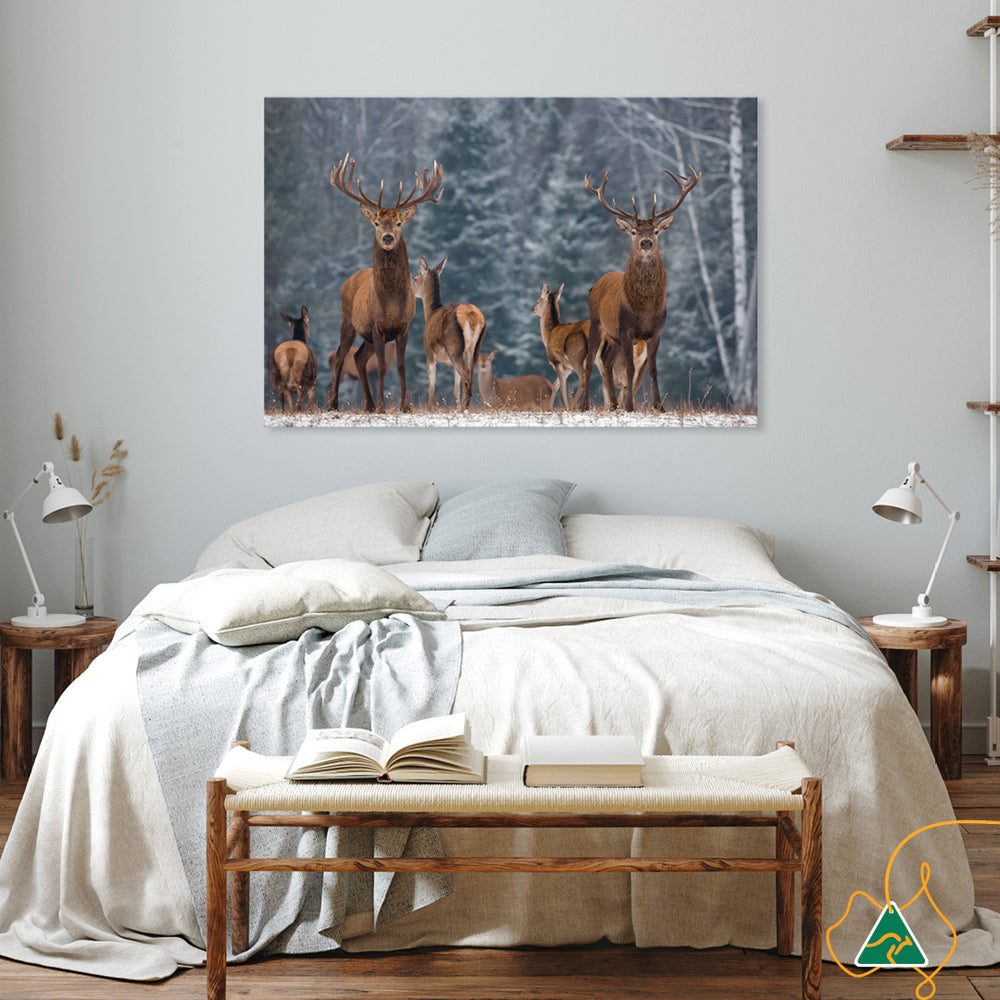 Canvas Print: Sentinel I is a stunning portrait of two male deer with a birch forest backdrop. The versatile neutral grey and brown tones of Sentinel will add a rustic charm to your interior decor. Sentinel has a peaceful quality and is printed on high quality glossy poly-cotton canvas featuring high whiteness and superior colour brilliance and image definition with UV stabilised solvent ink. The canvas is stretched over a sturdy support frame with D-Rings and strung with cord ready to hang. Australian made under an Australian Made Campaign Ltd licence.