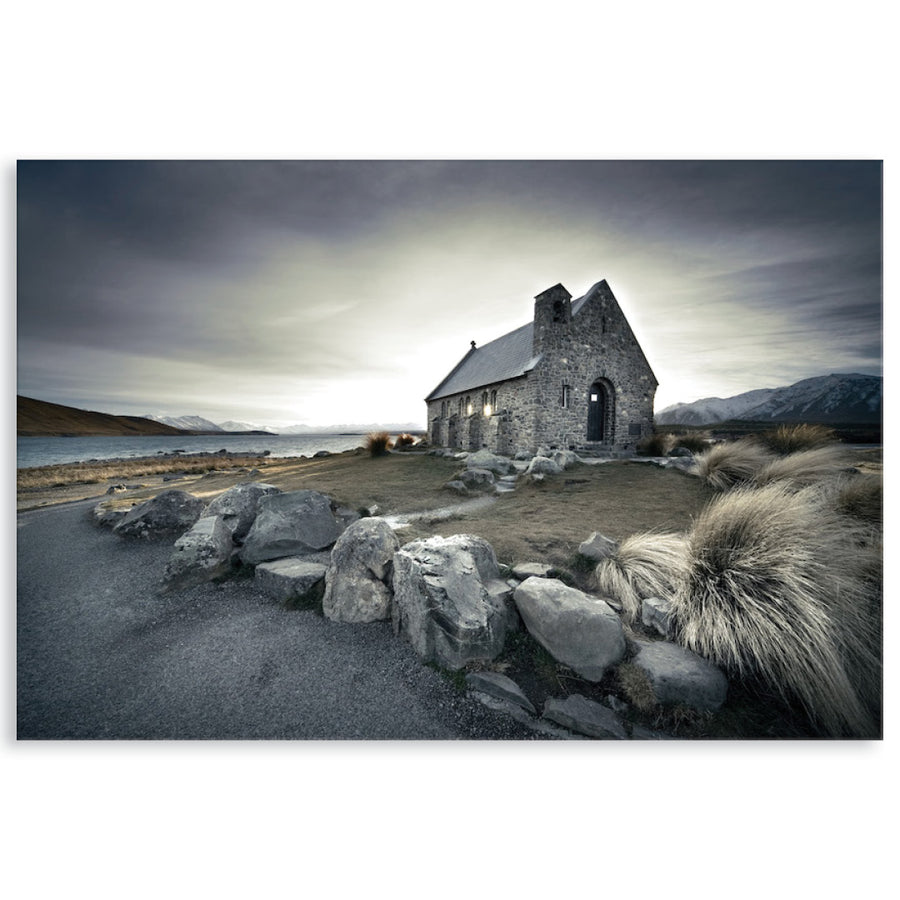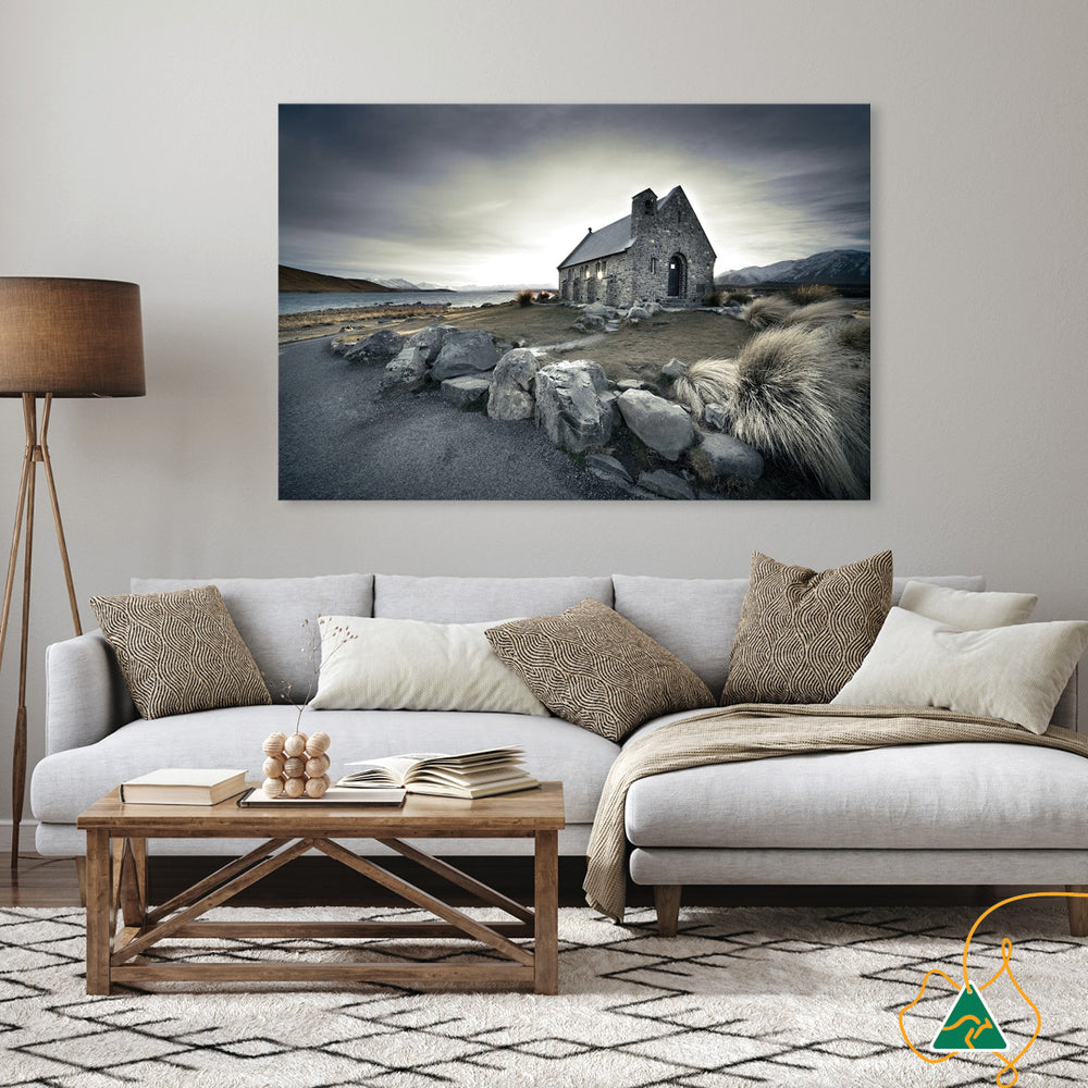 Canvas Print: Serene is a stunning landscape in neutral grey and golden tones. The old stone building sits on the shores of a lake surrounded by mountains. The sun's rays illuminate the sky behind the building and give the image a majestic quality. Serene is printed on high quality glossy poly-cotton canvas featuring high whiteness and superior colour brilliance and image definition with UV stabilised solvent ink. The canvas is stretched over a sturdy support frame with D-Rings and strung with cord ready to hang. Australian made under an Australian Made Campaign Ltd licence.
