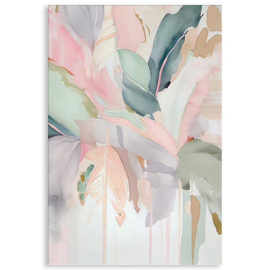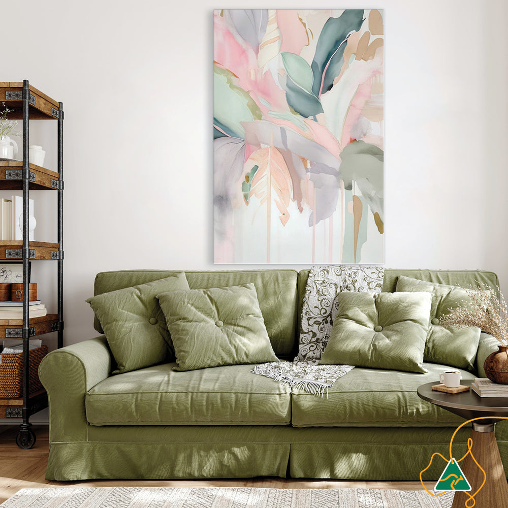 Canvas Print: Sorbet Tropics I is an abstract tropical botanical in soft pastel colours. Sorbet Tropics I is a Boho take on a lush tropical jungle landscape. Muted greens and soft pinks have a dream-like, comforting quality which is cozy and inviting. Sorbet Tropics I is a contemporary painted design and is printed on high quality glossy poly-cotton canvas featuring high whiteness and superior colour brilliance and image definition with UV stabilised solvent ink. The canvas is stretched over a sturdy support frame with D-Rings and strung with cord ready to hang. Australian made under an Australian Made Campaign Ltd licence.