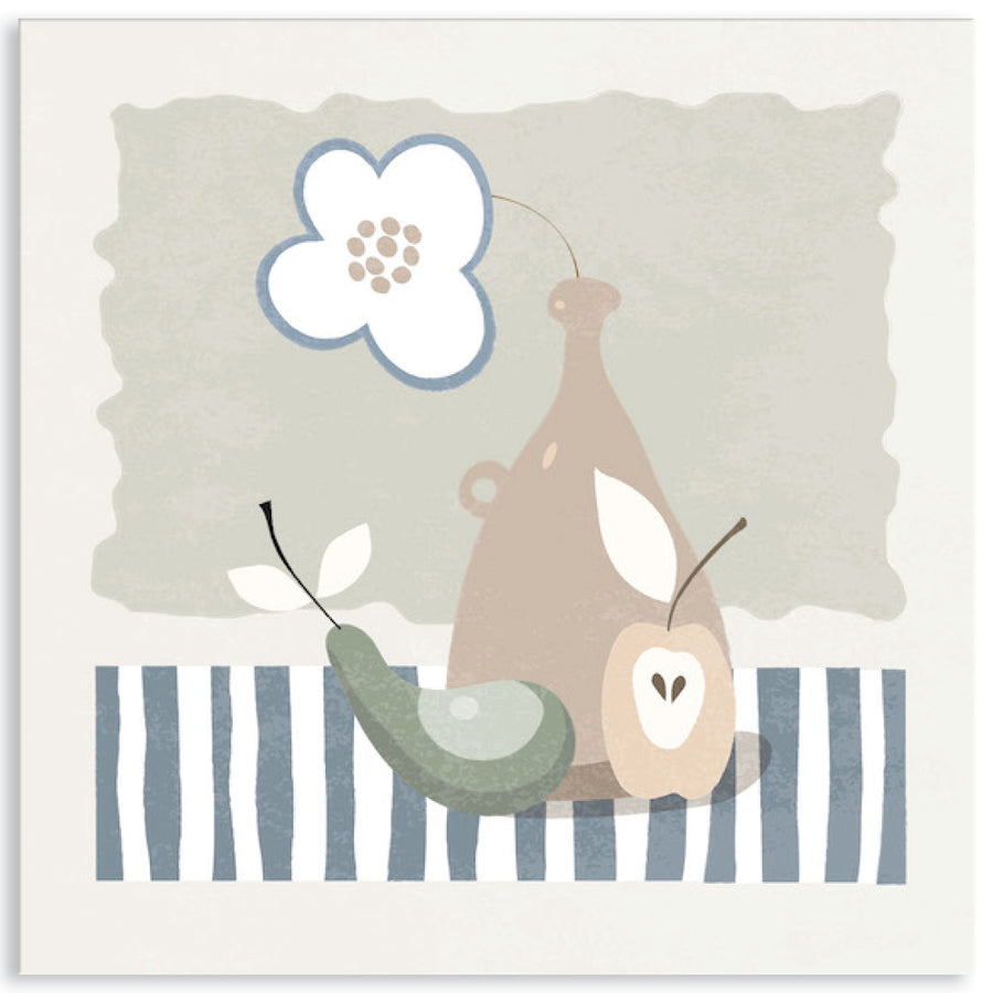 Canvas Print: Still Life II is a modern still life in muted tones of a single flower in a vase and a pear and an apple. Still Life II is a contemporary minimal graphic creating a happy, playful vibe. Still Life II is the second in a series of three and is printed on high quality glossy poly-cotton canvas featuring high whiteness and superior colour brilliance and image definition with UV stabilised solvent ink. The canvas is stretched over a sturdy support frame with D-Rings and strung with cord ready to hang. Australian made under an Australian Made Campaign Ltd licence.